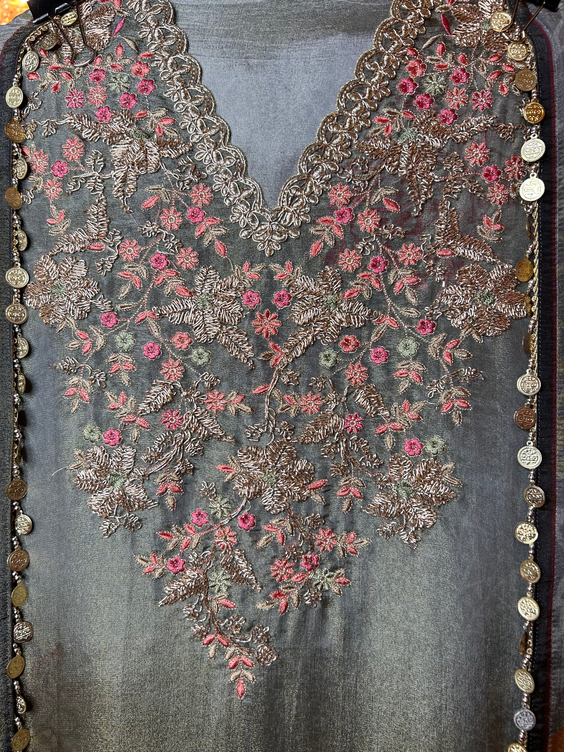 A lightweight organza base featuring detailed thread and zari work along the neckline. Its natural sheen and intricate accents lend the piece an ethereal presence, perfect for day-to-dusk elegance.