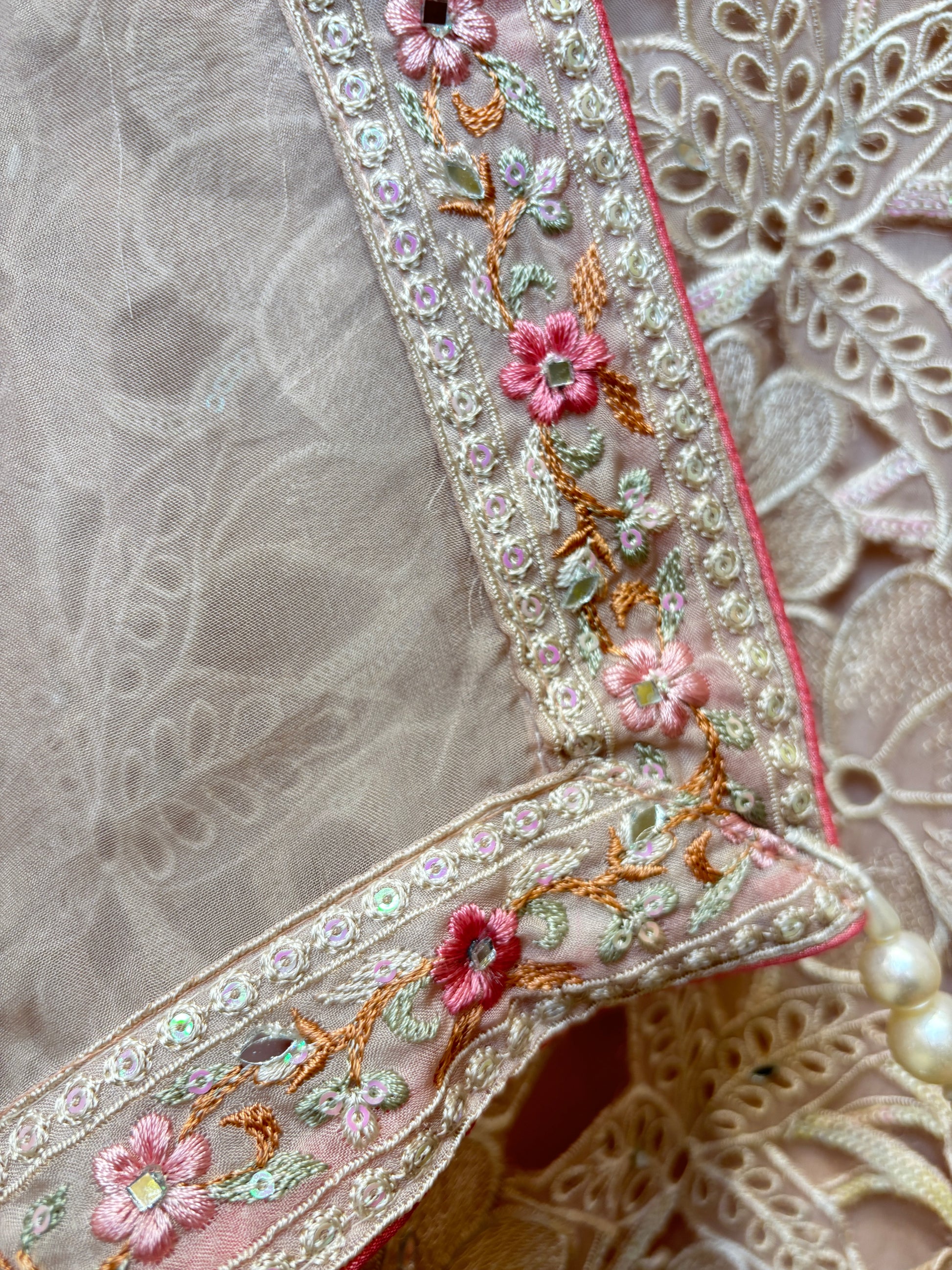 💎 organza dupatta (2.25 meters)— light as a feather, allowing for effortless grace. Its sheer texture subtly balances the heavier embellishments on the shirt, making it ideal for festive occasions, intimate weddings, or grand celebrations.