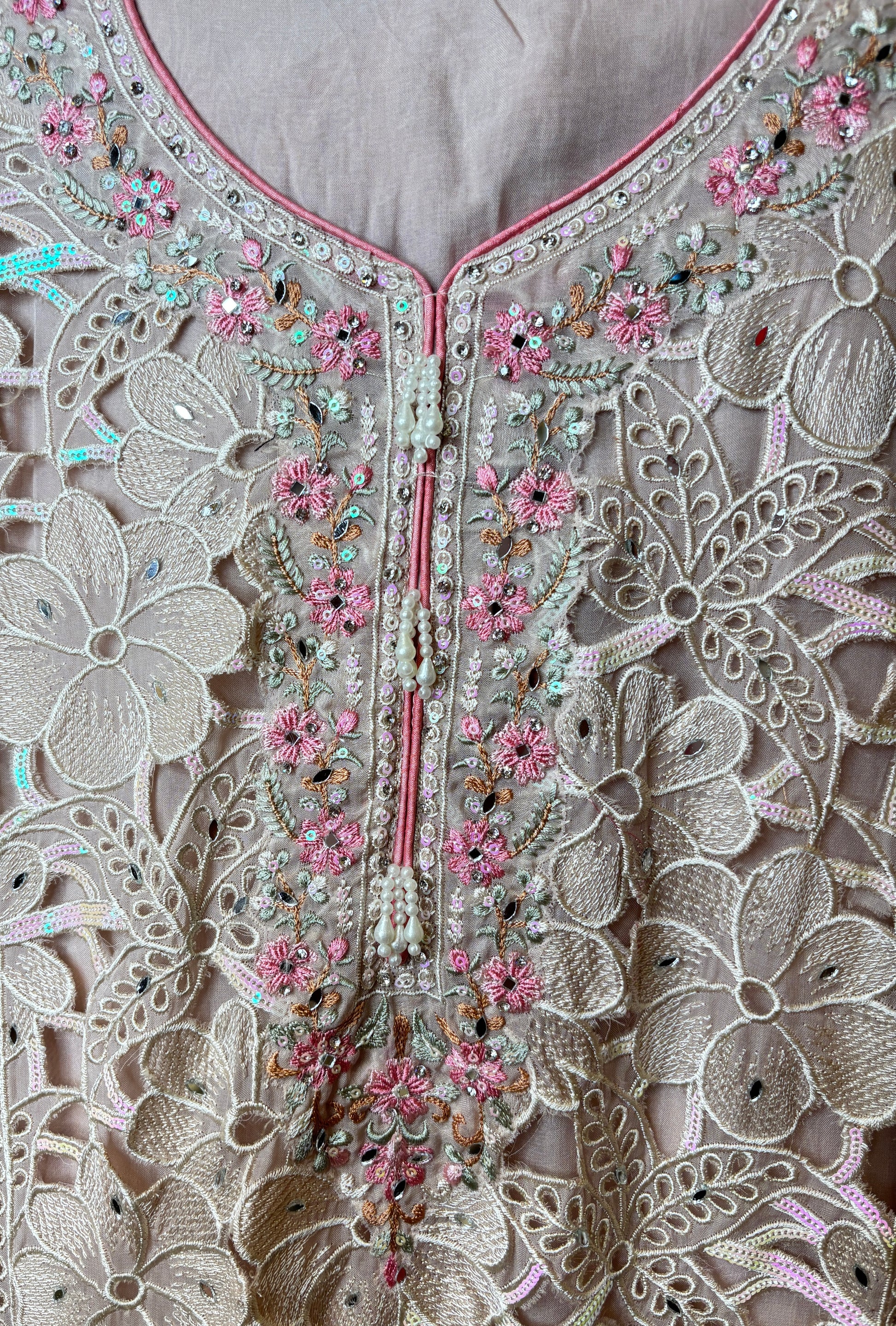 💎Organza Shirt with all cur work and real mirror work (2.5 meters)— intricately adorned with all-over cut work and real mirror embellishments. Each mirror is delicately hand-set to create a dazzling effect, making the shirt a true masterpiece of craftsmanship.