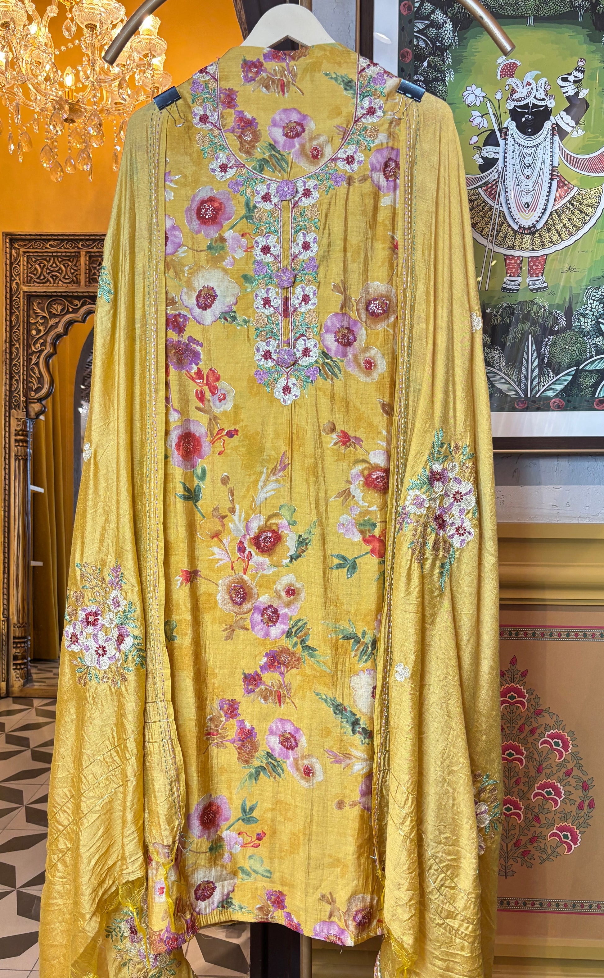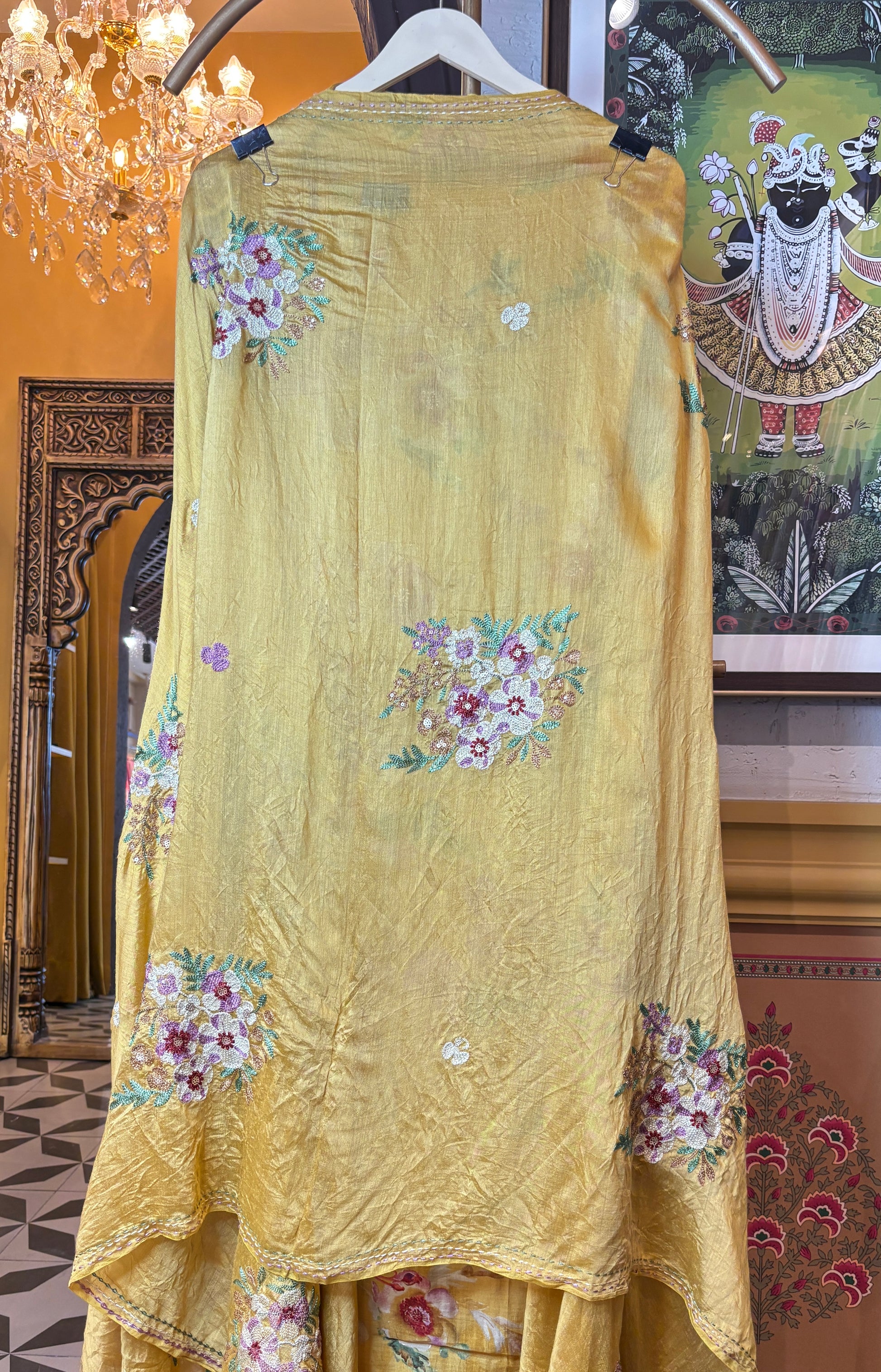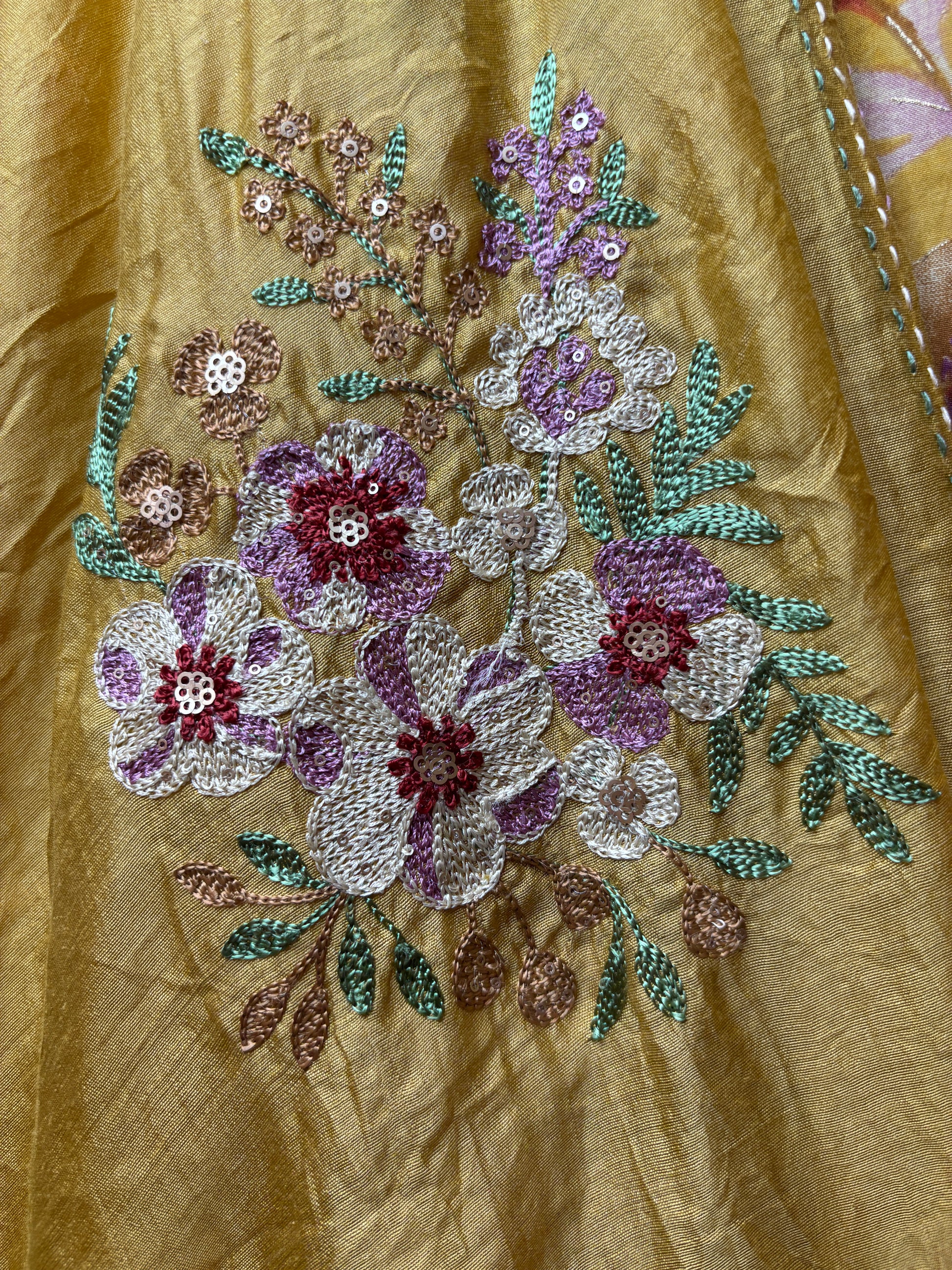 A delicate canvas adorned with intricate thread flowers — it adds a poetic, handcrafted touch to the entire ensemble.