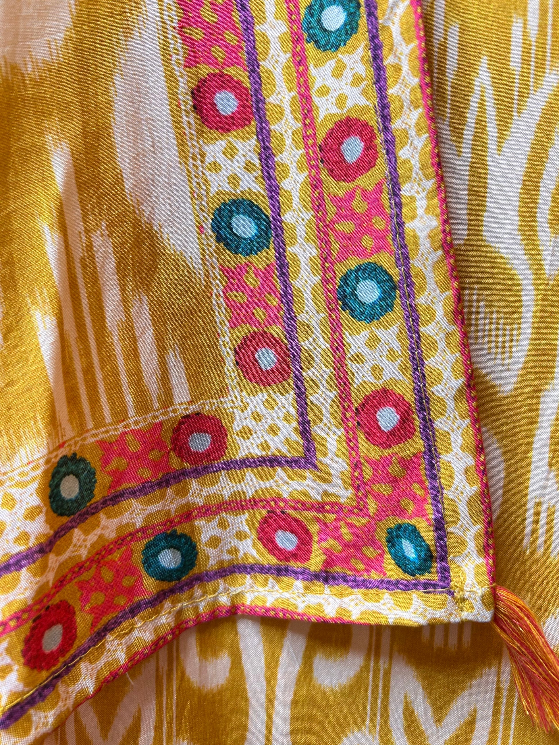 A classic Ikkat pattern on soft muslin, elevated with delicate hand embroidery along the neckline — a blend of bold print and fine craftsmanship.