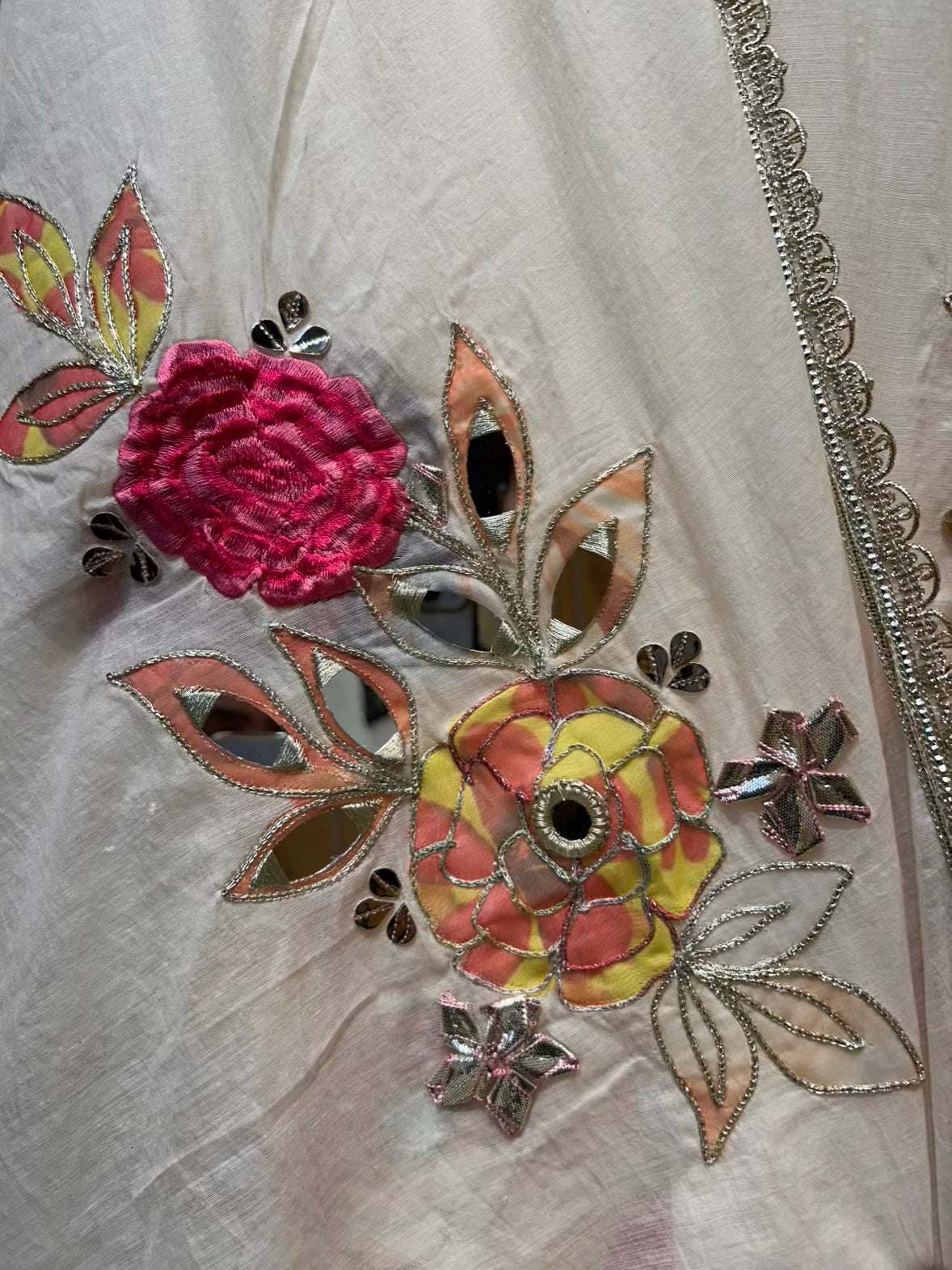 • Mul Cotton Dupatta (2.25 mtrs) – Detailed with mirror and leather work to complement the suit beautifully.