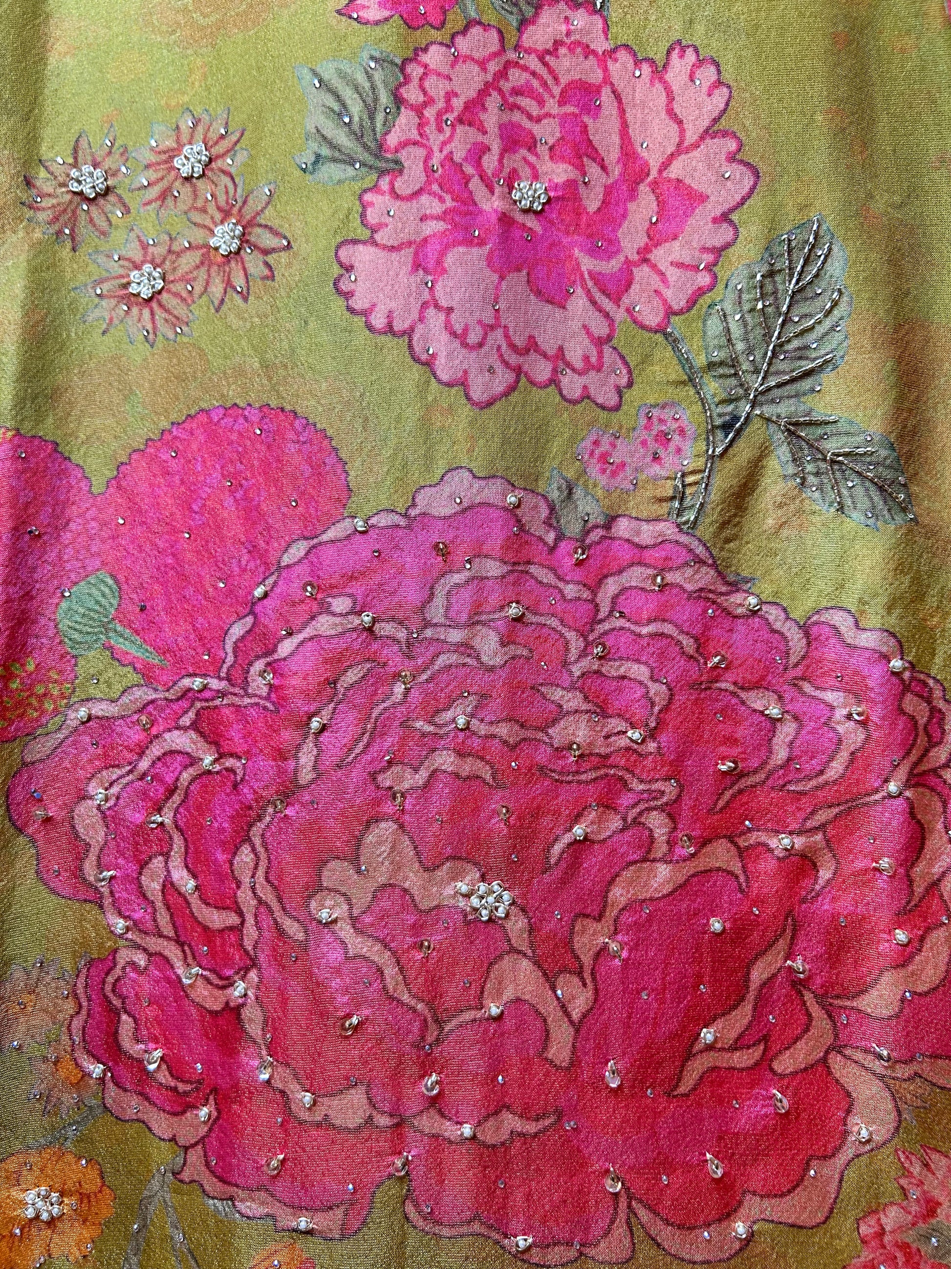 Featuring a hand-embroidered neckline, this printed organza shirt glows softly, adding a luminous touch to your wardrobe.