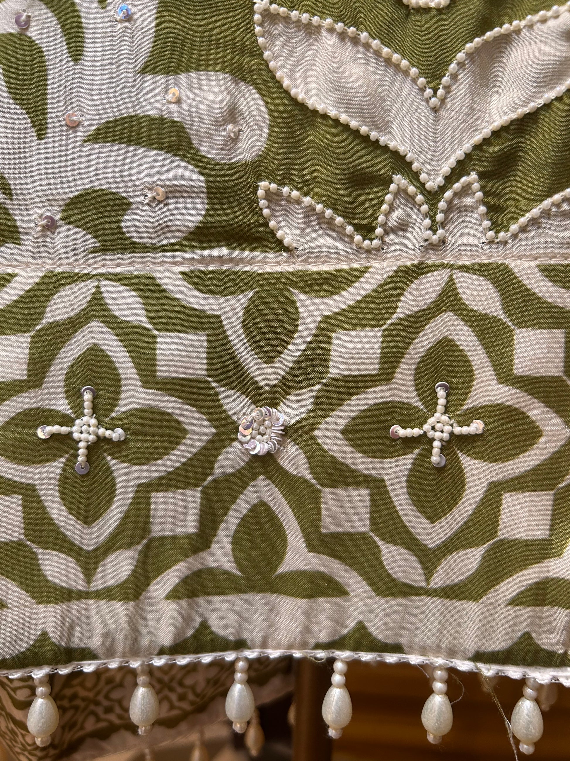 Paired with a smooth silk bottom (2.5 mtr), this ensemble balances flowy textures with opulent accents — making it ideal for celebratory days and evening gatherings.