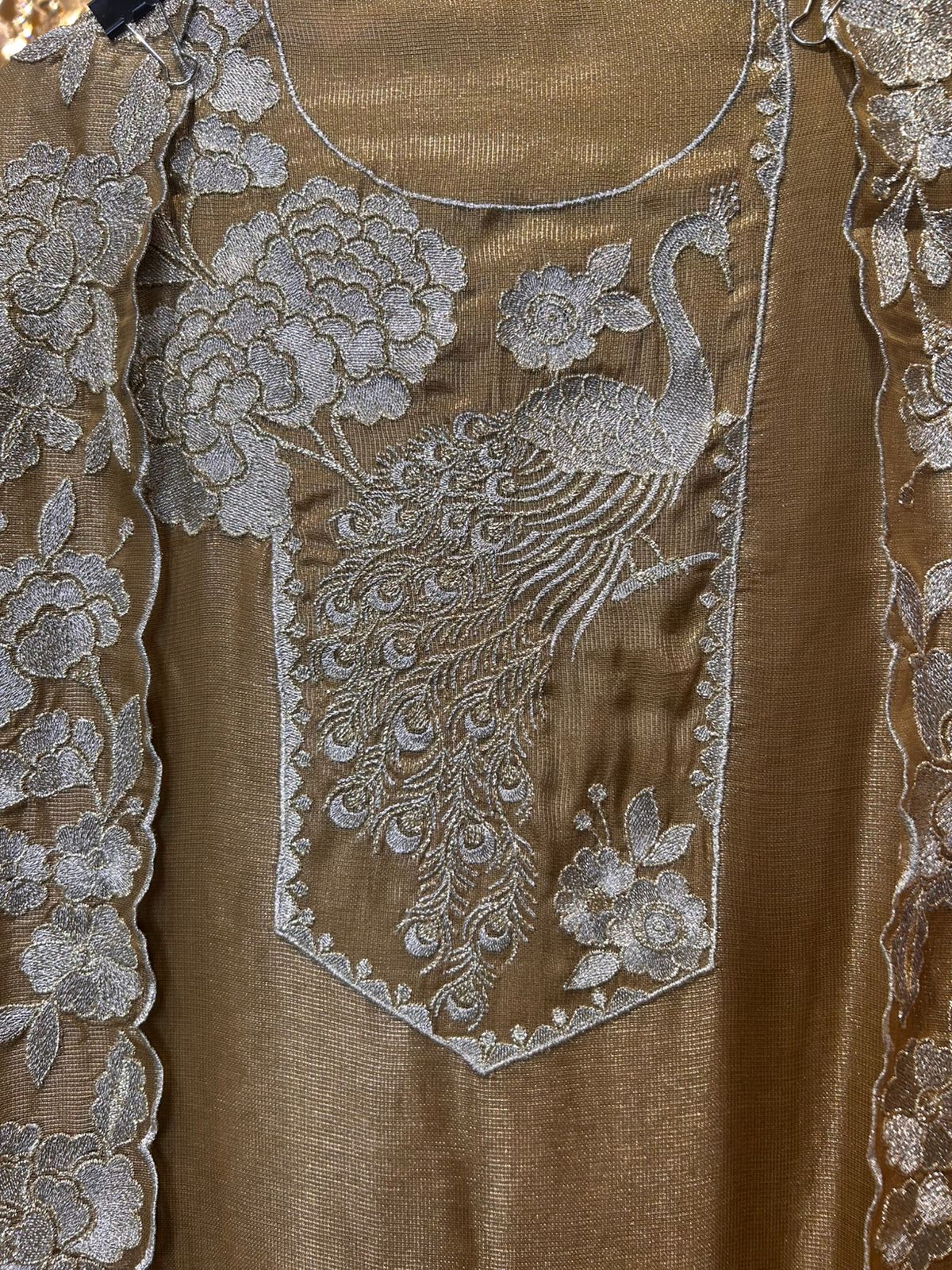 • Shimmer Organza Shirt (2.5 mtrs) – Highlighted with intricate zari work along the neckline for a regal touch.