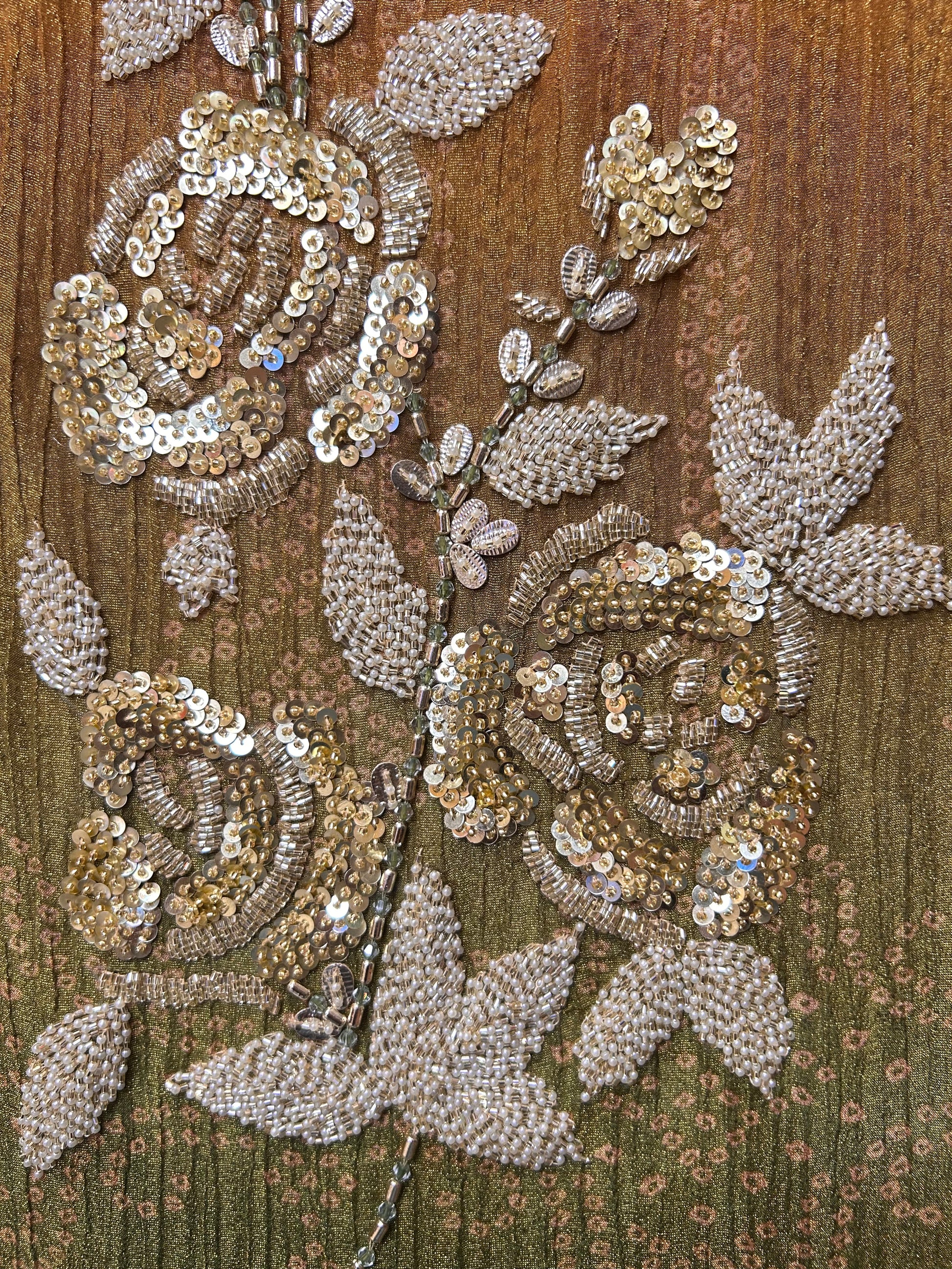 Shimmery texture of tissue fabric adorned with intricate Gera handwork.