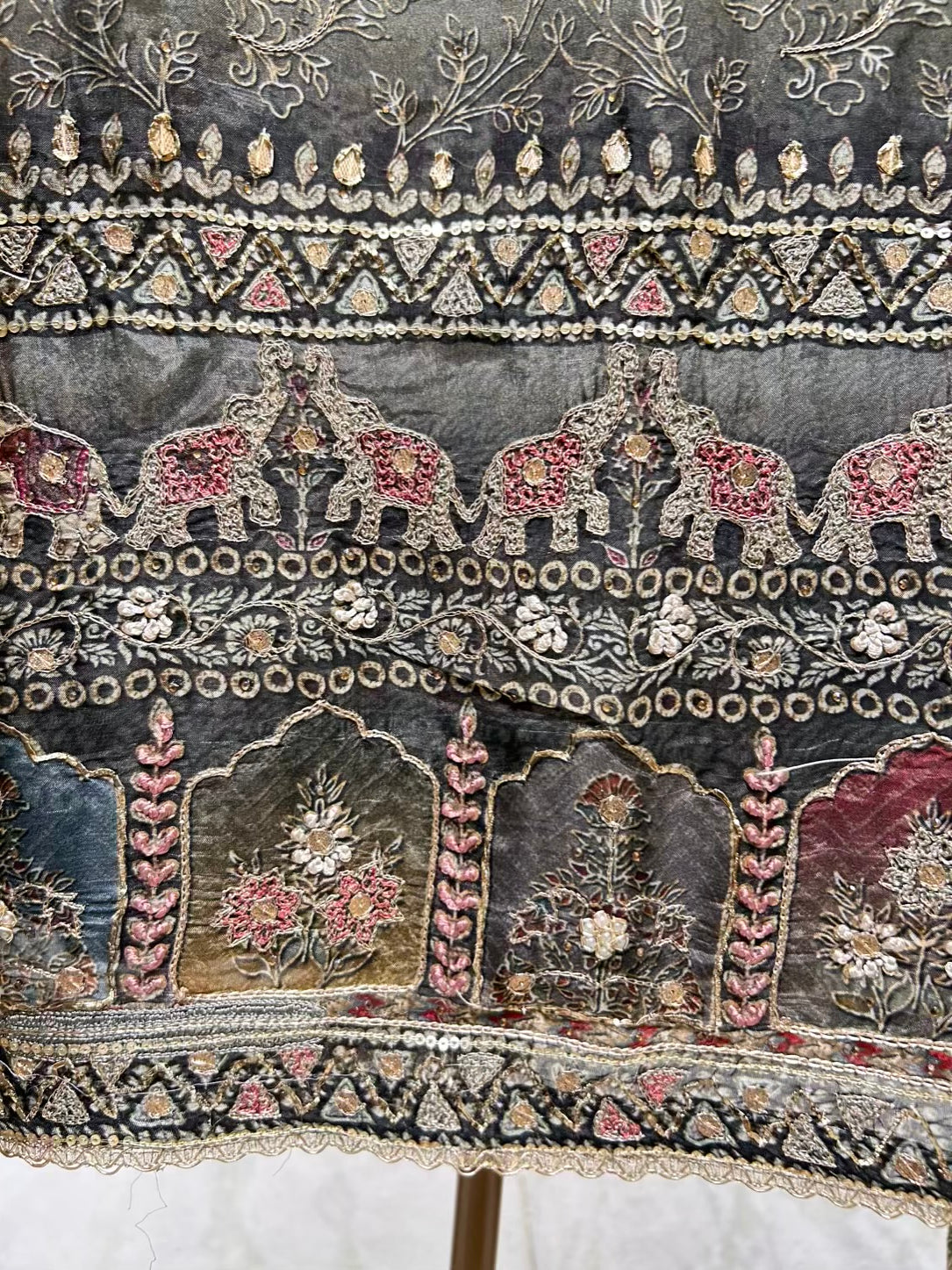 Paired with a coordinated pure crepe dupatta featuring matching digital prints and zari accents, this ensemble feels refined yet effortlessly wearable. The smooth crepe bottom completes the look, offering comfort, movement, and a polished finish — ideal for both day and evening occasions.