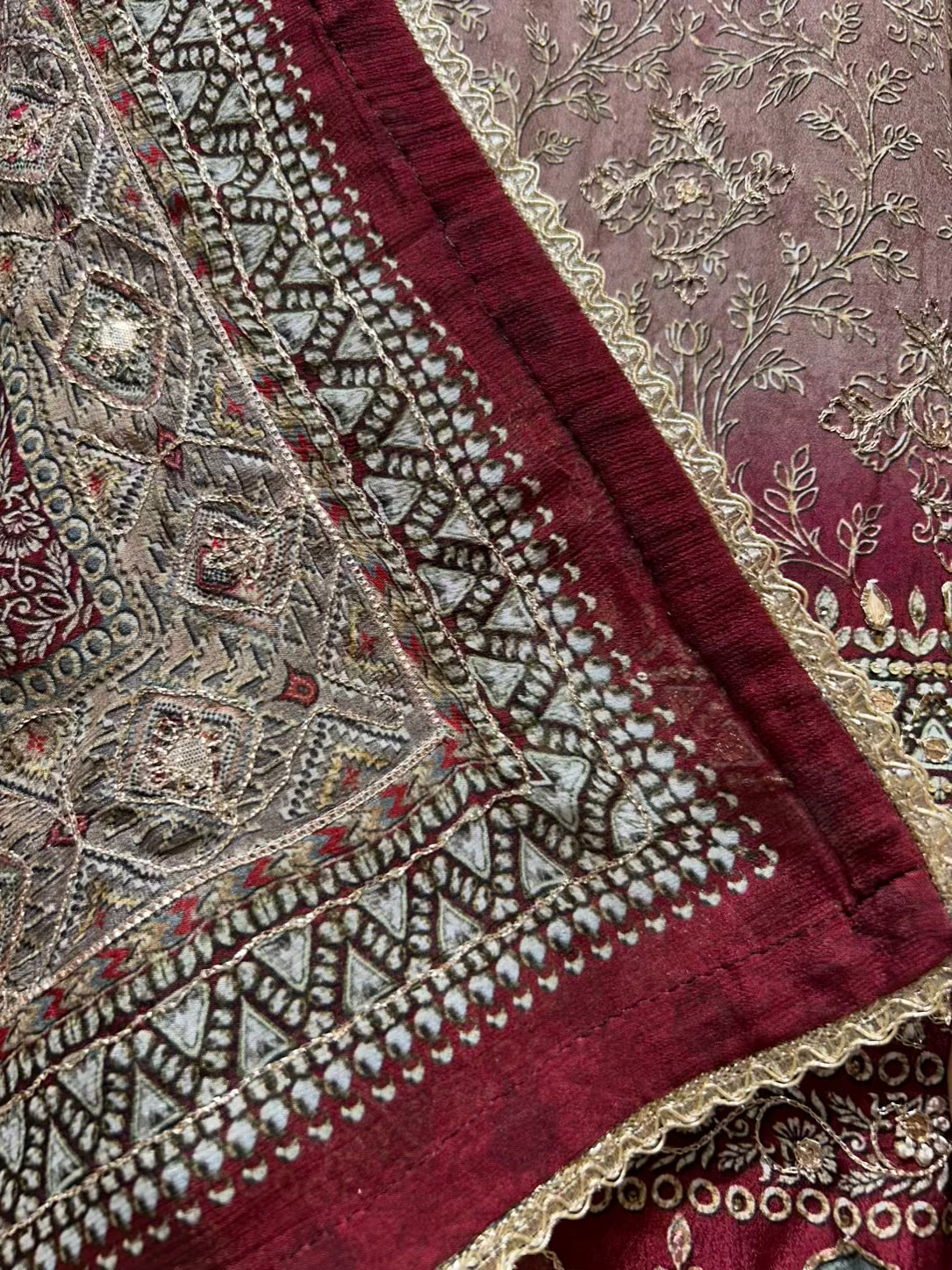 Paired with a coordinated pure crepe dupatta featuring matching digital prints and zari accents, this ensemble feels refined yet effortlessly wearable. The smooth crepe bottom completes the look, offering comfort, movement, and a polished finish — ideal for both day and evening occasions.