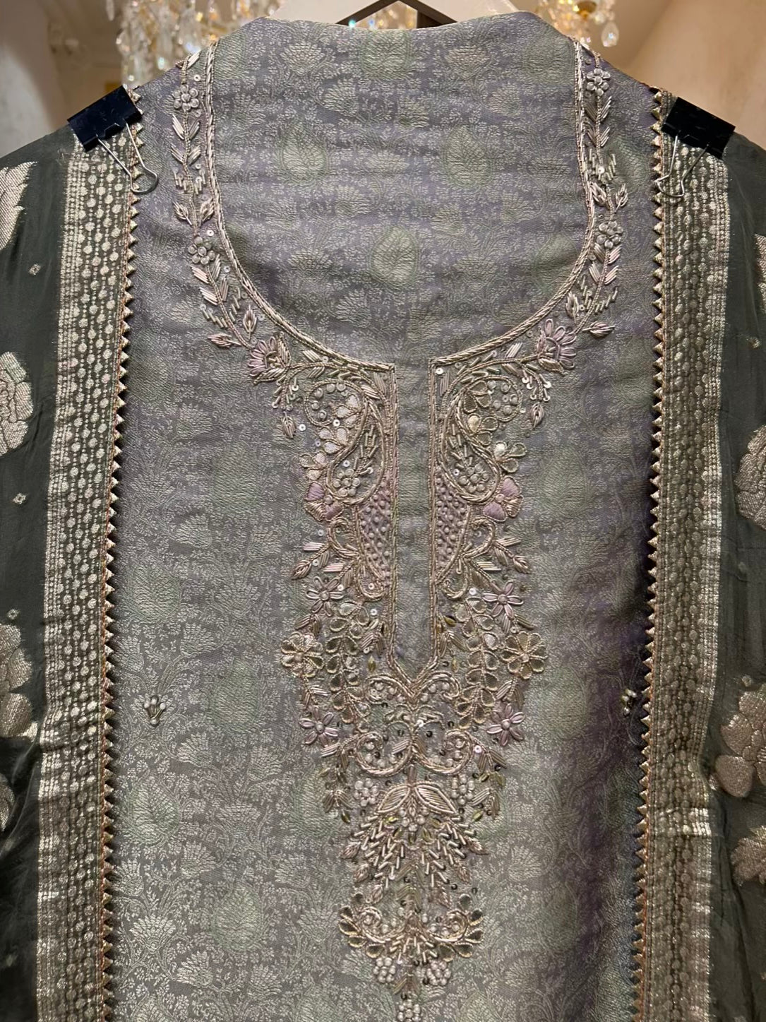 • Silk Brocade Suit with Neckline Handwork (2.5 mtrs) – Rich brocade enhanced with delicate handcrafted detailing for a regal finish.