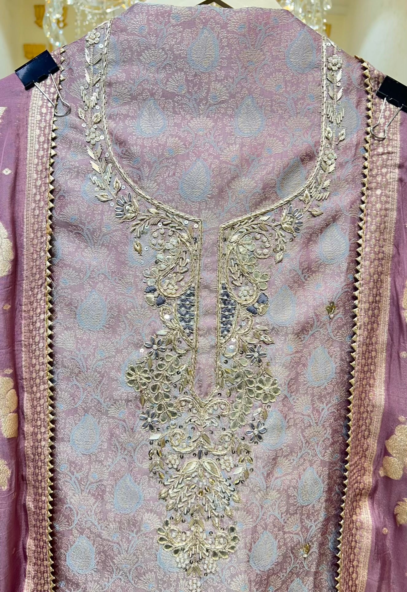 • Silk Brocade Suit with Neckline Handwork (2.5 mtrs) – Rich brocade enhanced with delicate handcrafted detailing for a regal finish.