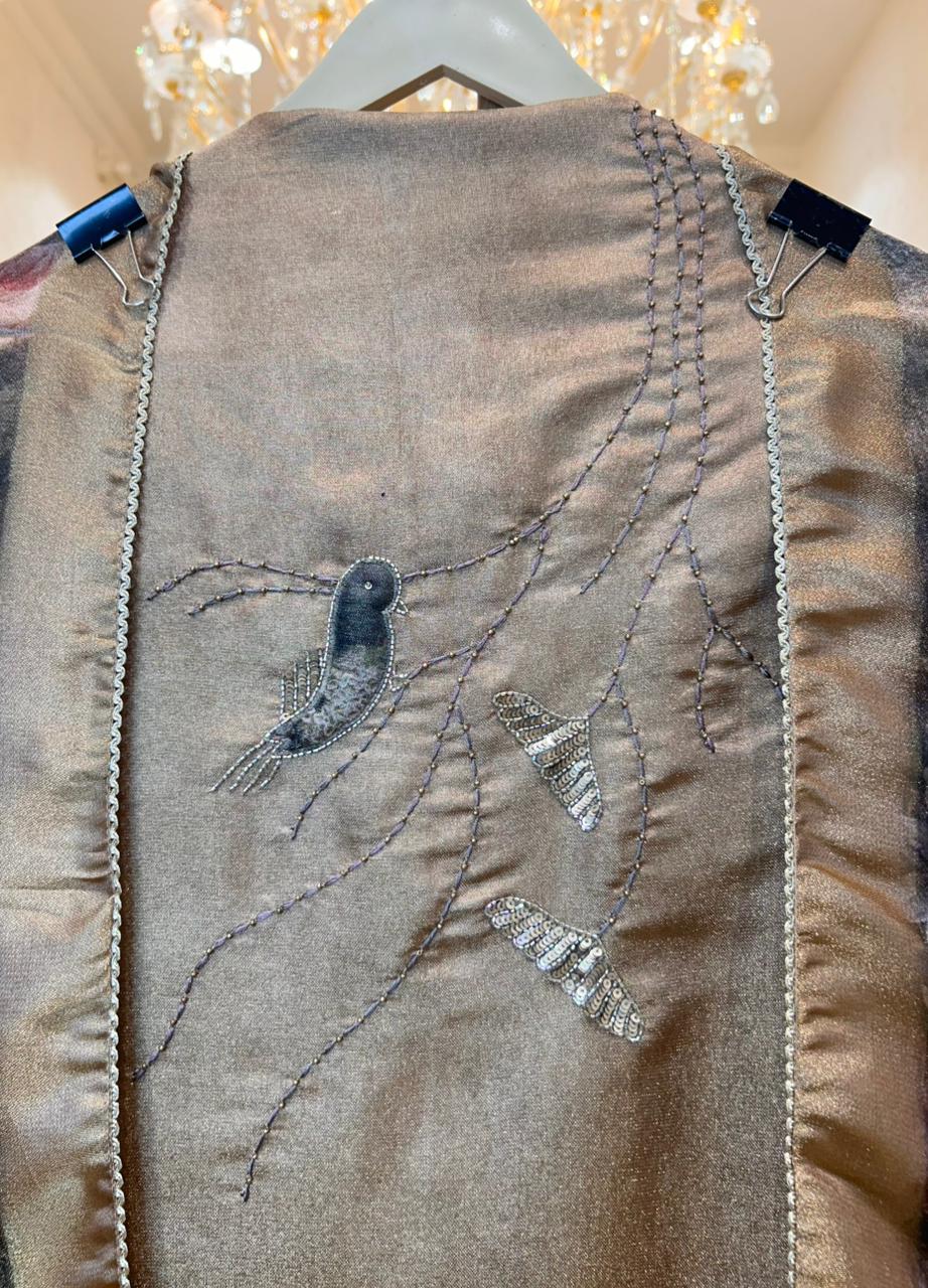 • Tissue Organza Shirt (2.5 mtrs) — Adorned with intricate neckline handwork that highlights its luminous texture.