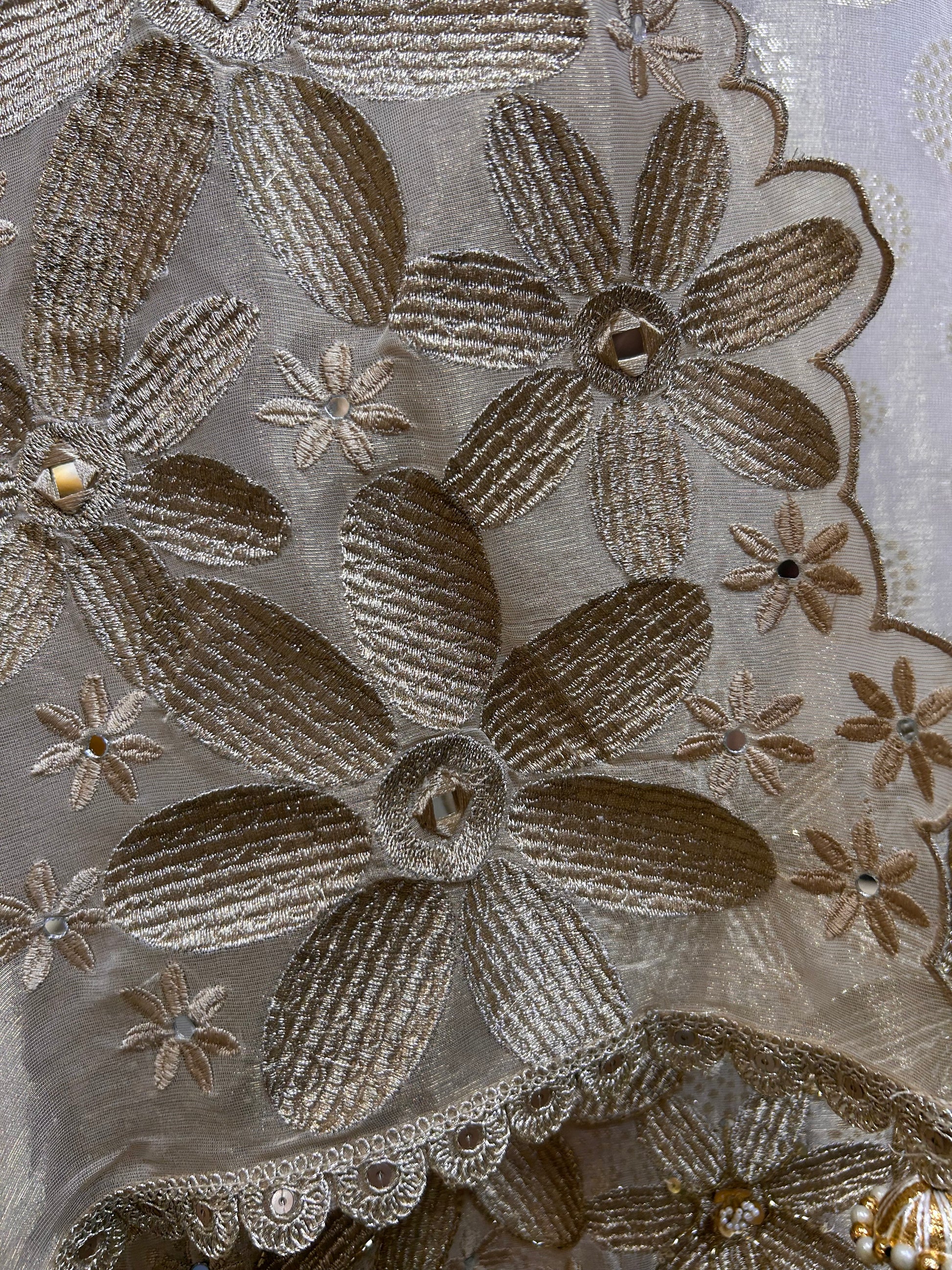 • Shimmer Organza Dupatta with Cutwork & Floral Zari Accents + Lace Detailing – 2.25 meters