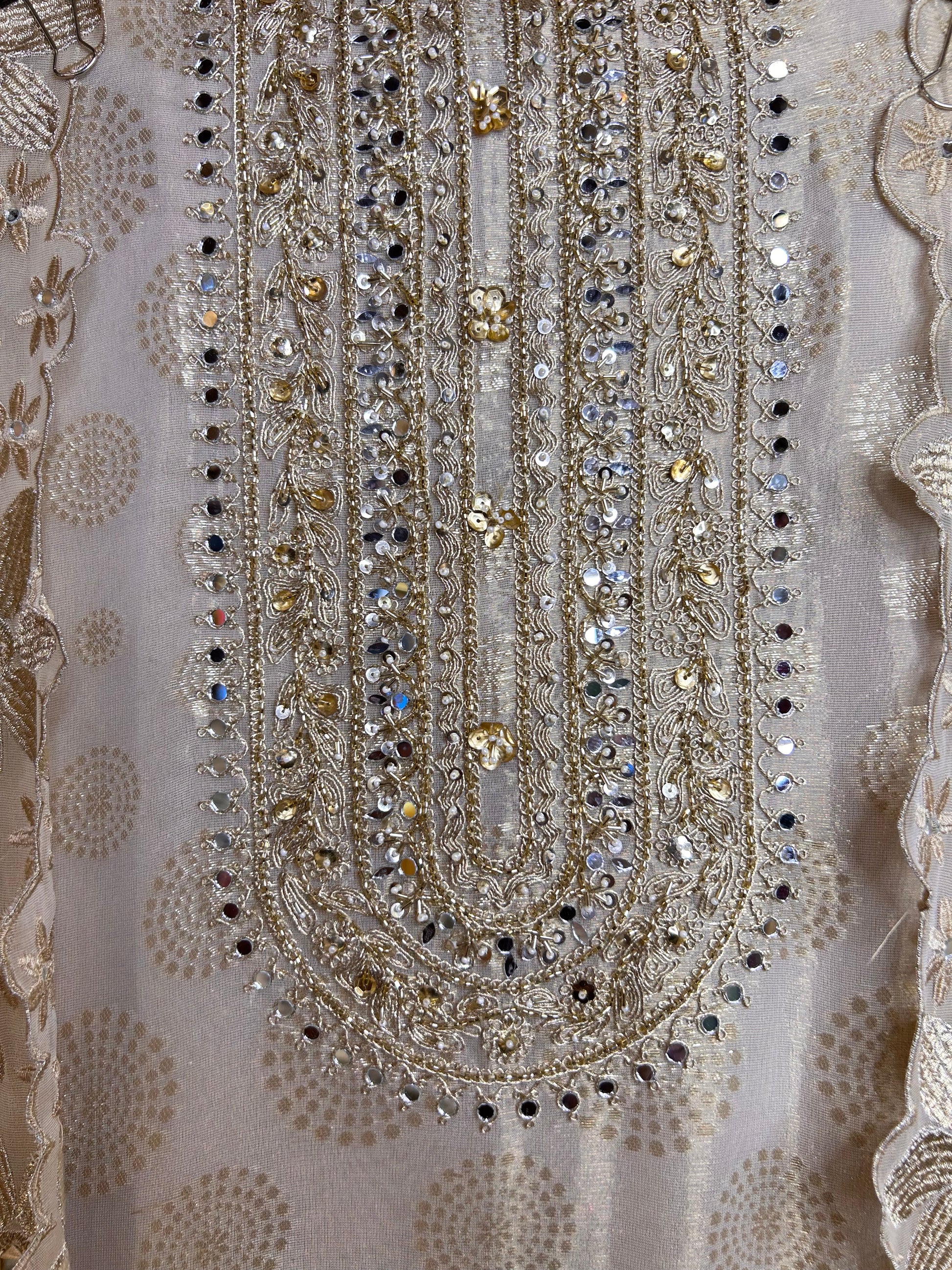 • Shimmer Organza Shirt with Neckline Handwork & Ghera Floral Zari Embroidery – 2.5 meters