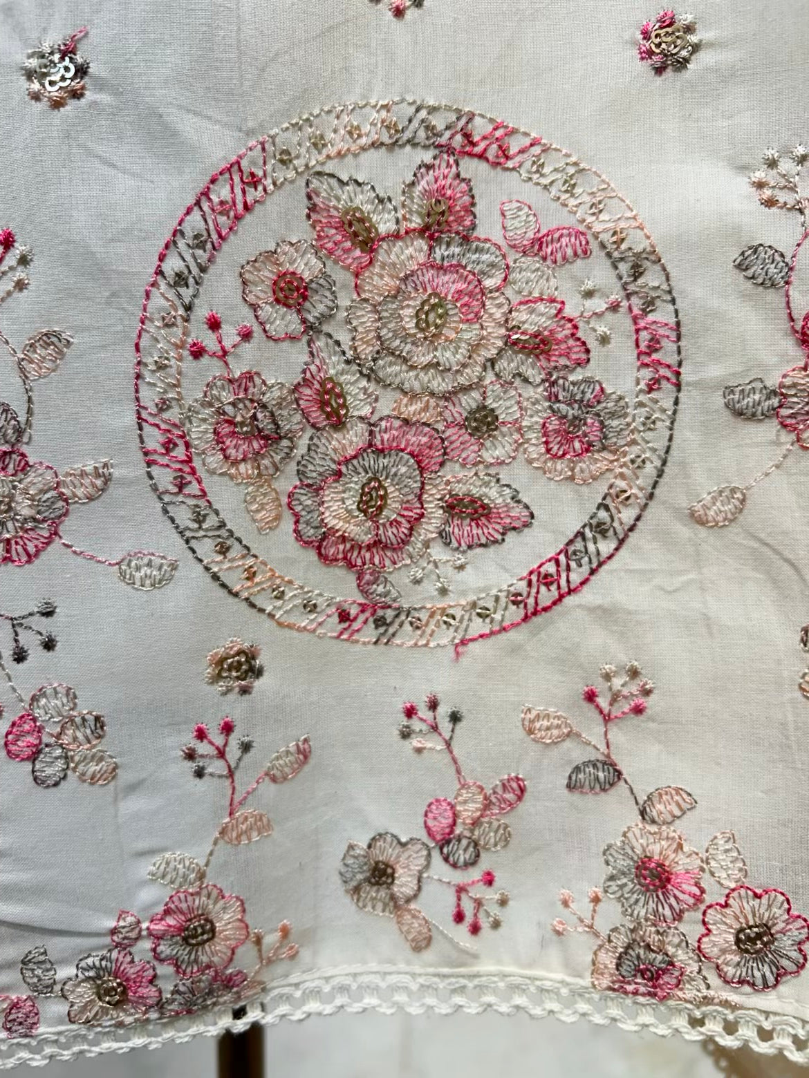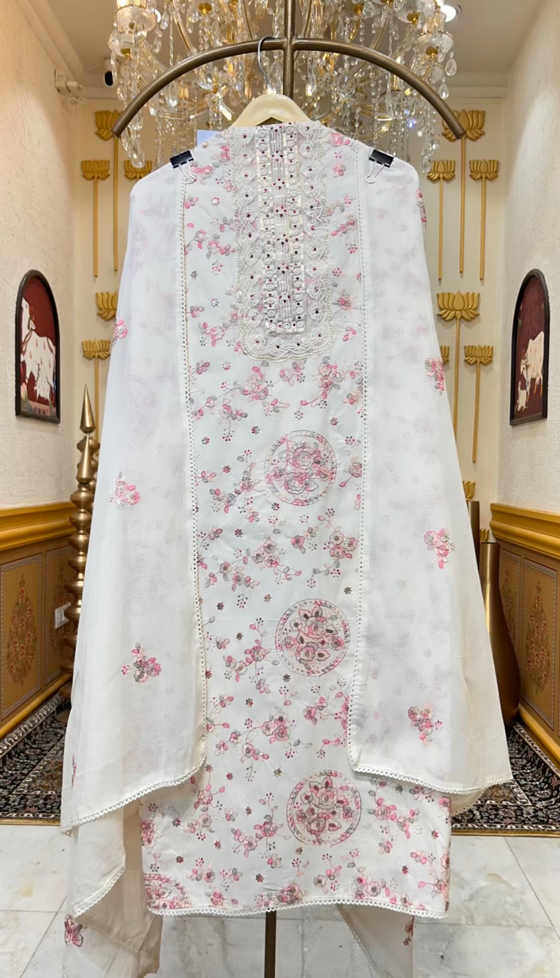 - Cotton Suit (2.5 mtrs) – Featuring olive thread embroidery on the neckline, organza patch detailing, and fine moti work.