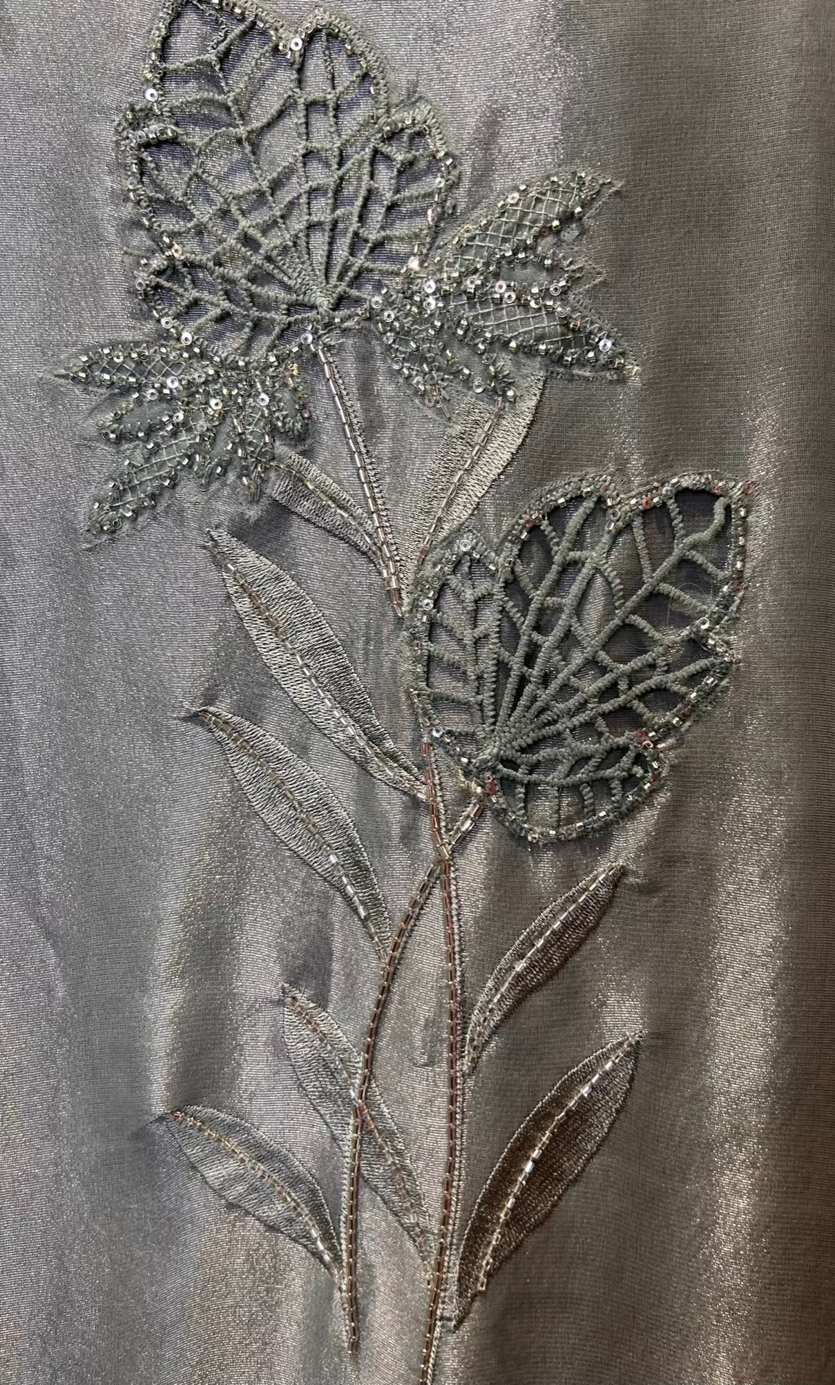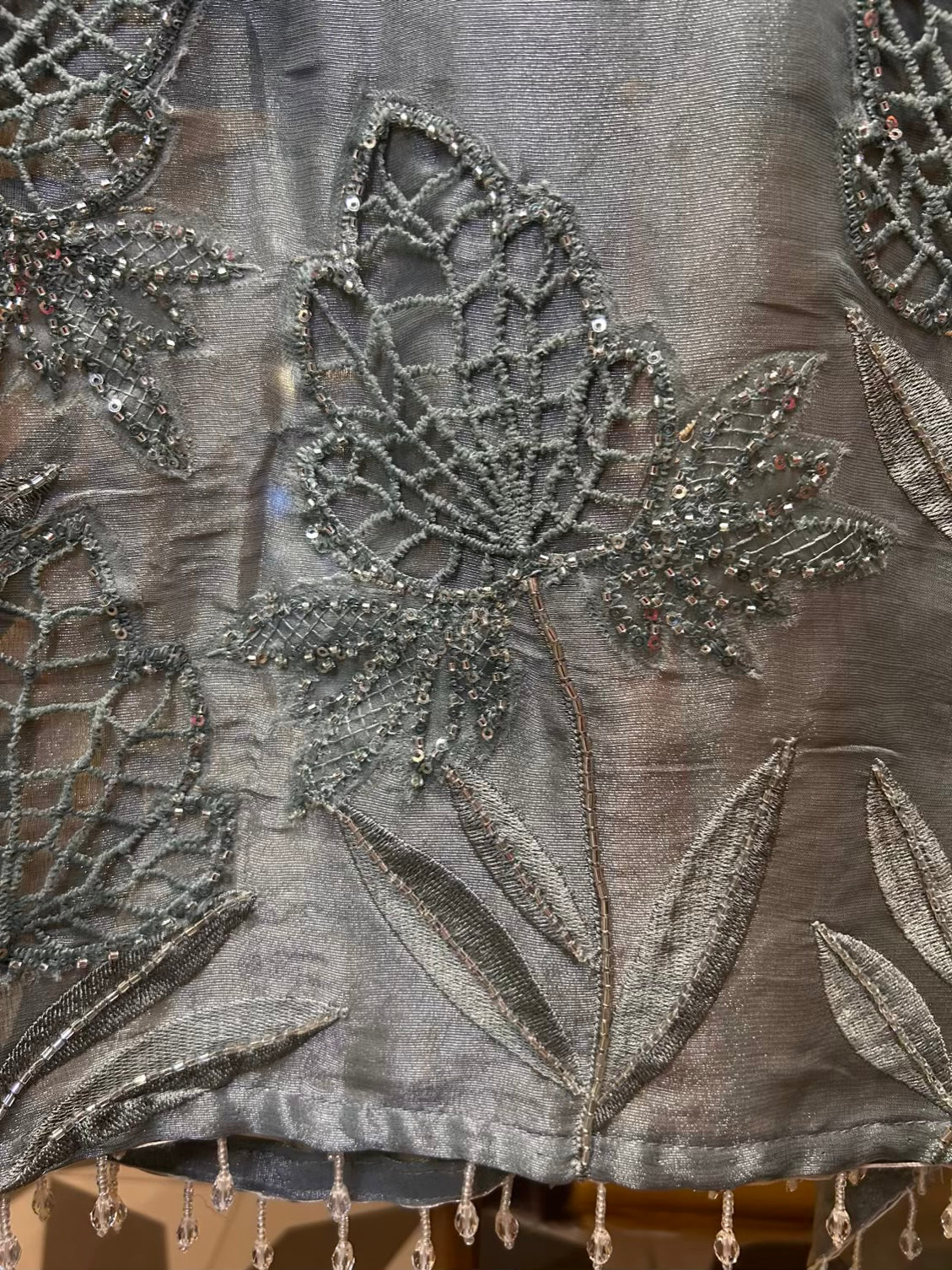 Ethereal, elegant, and timeless — the Zarina-é-Noor Suit captures the essence of classic luxury with its soft shimmer and intricate craftsmanship. The shimmer organza shirt, detailed with delicate handwork, radiates a gentle glow that moves beautifully with every step.