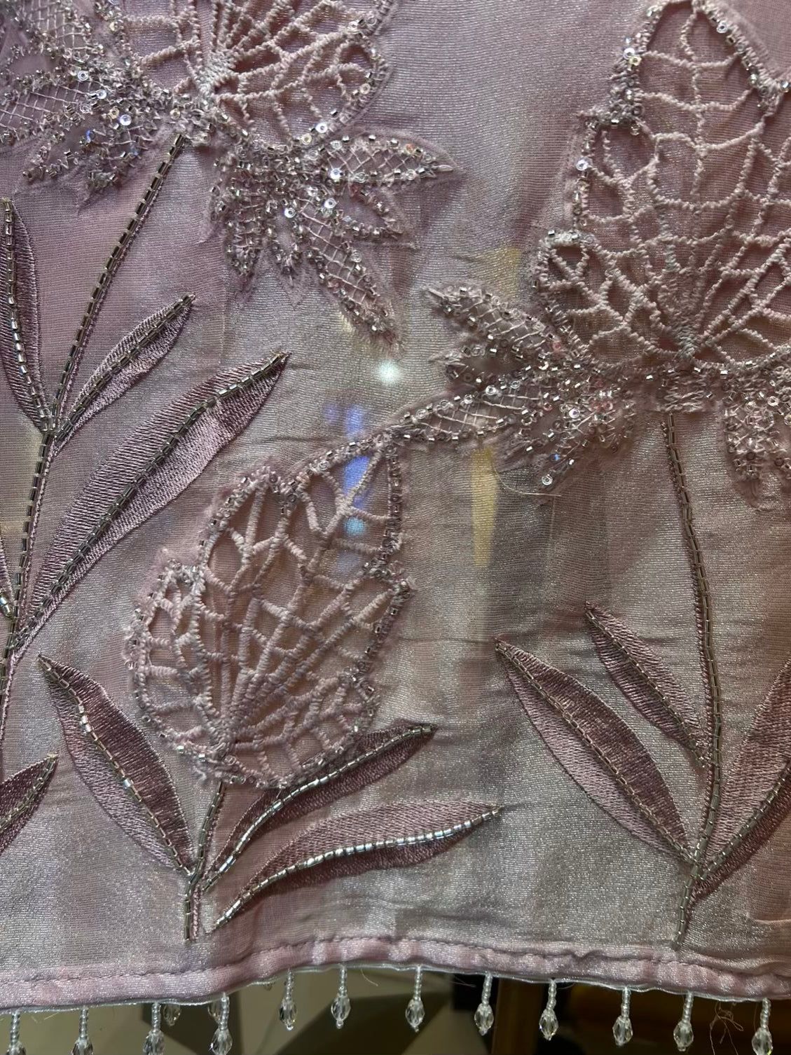Paired with a matching shimmer organza dupatta that adds a sheer, graceful finish, and a silk bottom that anchors the look in sophistication, this ensemble is a perfect ode to refined femininity.