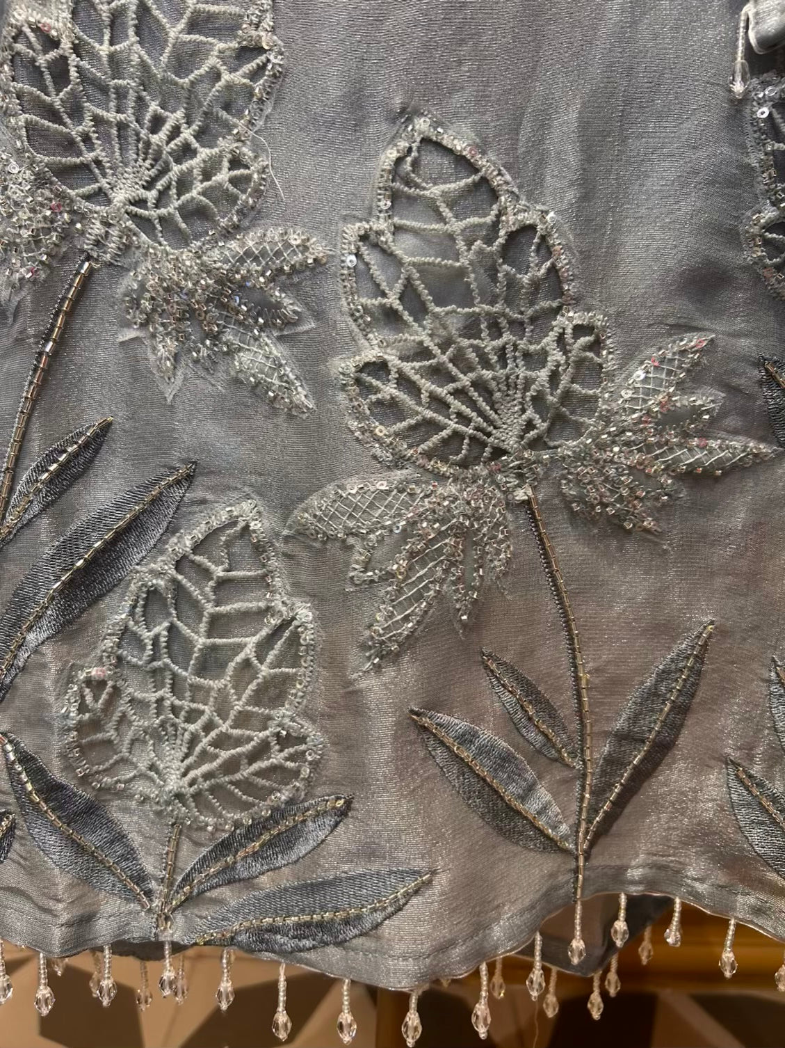 Ethereal, elegant, and timeless — the Zarina-é-Noor Suit captures the essence of classic luxury with its soft shimmer and intricate craftsmanship. The shimmer organza shirt, detailed with delicate handwork, radiates a gentle glow that moves beautifully with every step.