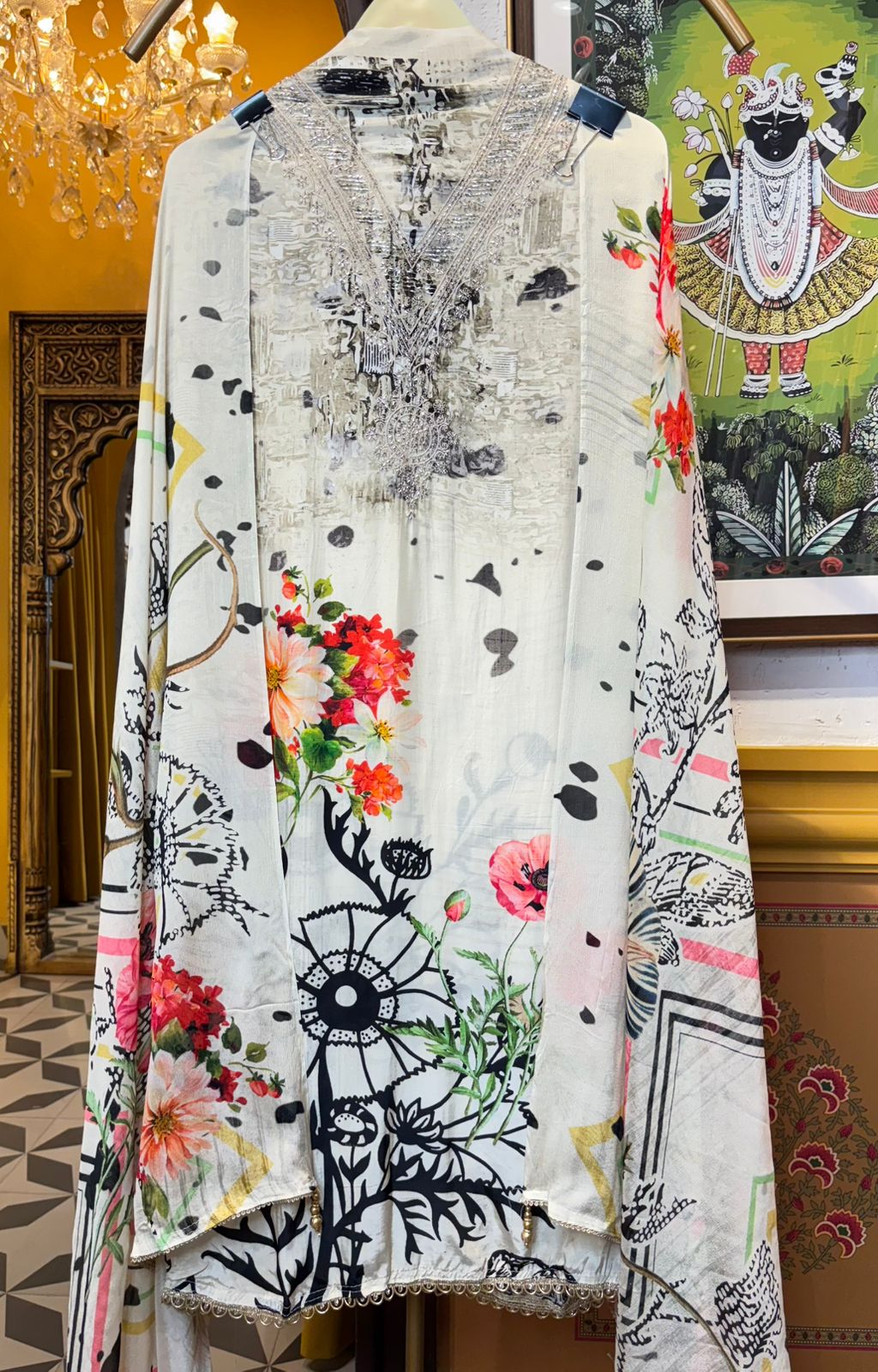 • Pure Crepe Shirt (2.5 mtrs) – Digitally printed and enhanced with handwork for a refined, artisanal finish.
