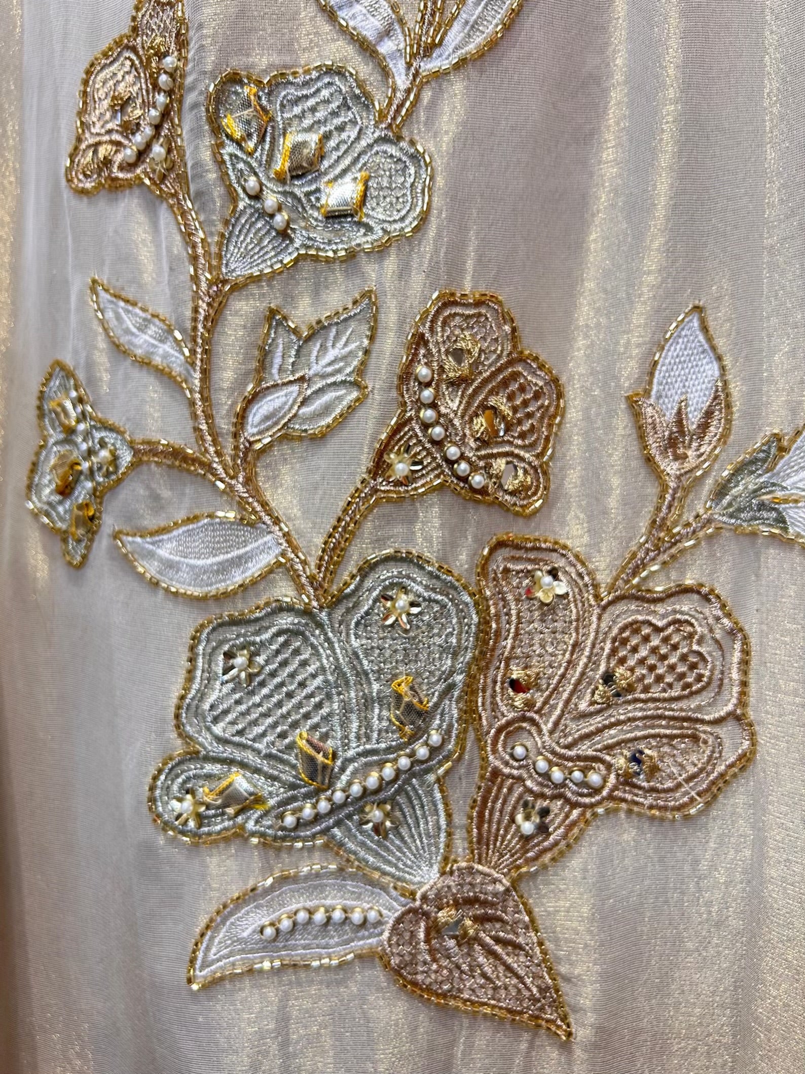 A vision of grace and luminous charm — the Zarisha Éclat Suit reflects the poetry of shimmer and fine craftsmanship. The shimmer organza suit, adorned with delicate handwork, radiates a soft, refined glow, perfect for both day and evening occasions. Paired with a coordinating shimmer organza dupatta detailed with an elegant four-side cutwork border and a smooth silk bottom, this ensemble embodies timeless sophistication wrapped in understated luxury.