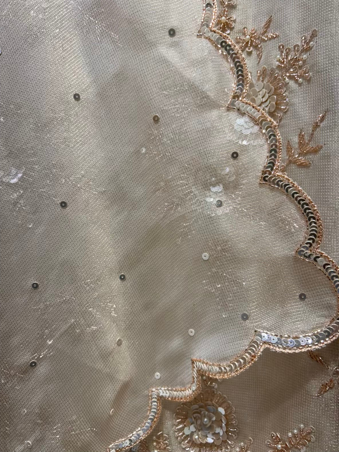 A celebration of fine detailing and luminous craft, the Zarisha Moti Chamak Suit brings together shimmer, texture, and graceful artistry. The shimmer organza suit is intricately embellished with cut dana, sequins, and delicate moti work, creating a refined sparkle that feels elegant and timeless rather than overpowering.
