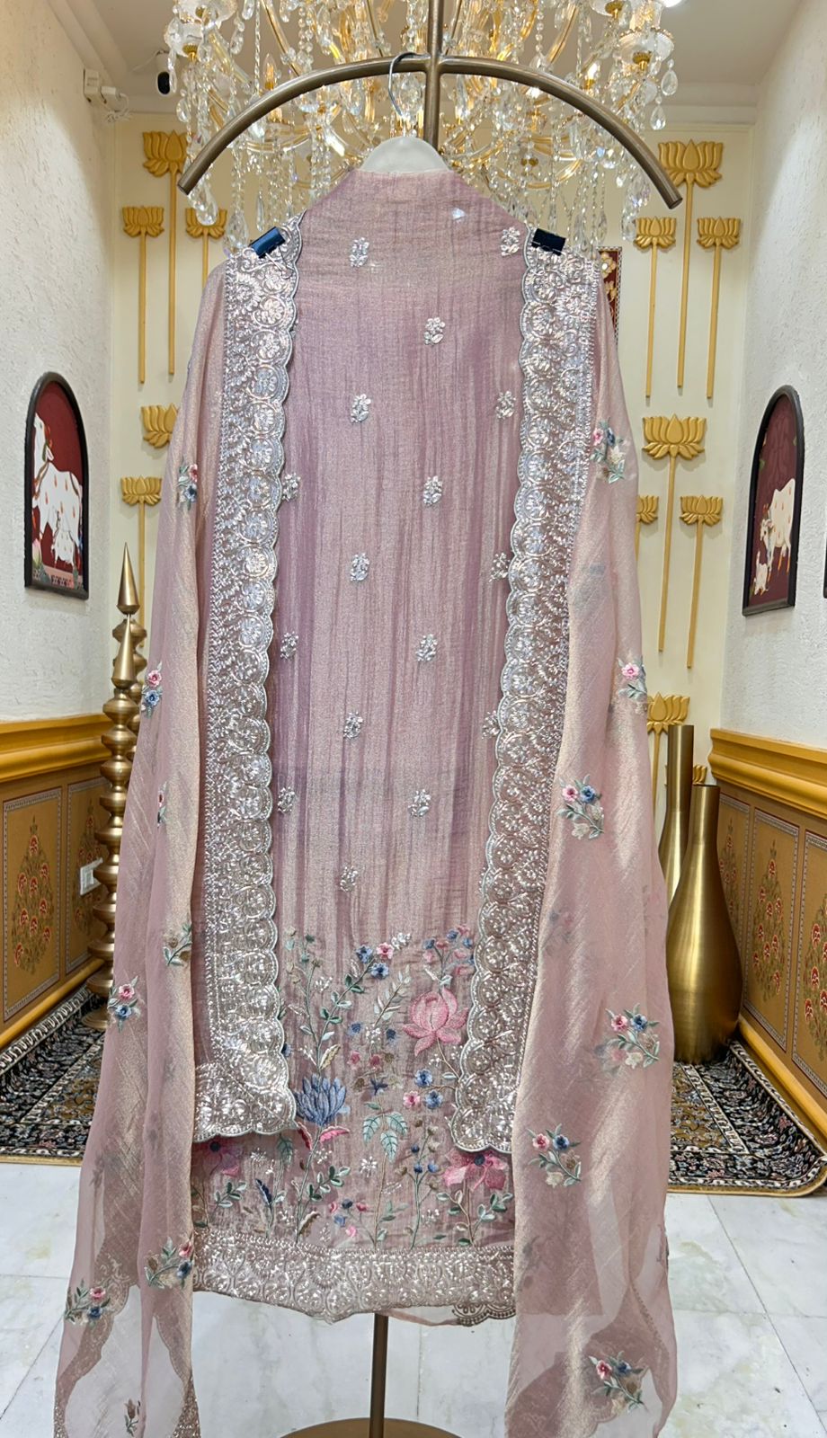• Crush Tissue Suit (2.5 mtrs) – Embellished with delicate thread embroidery and zari work for a refined festive finish.