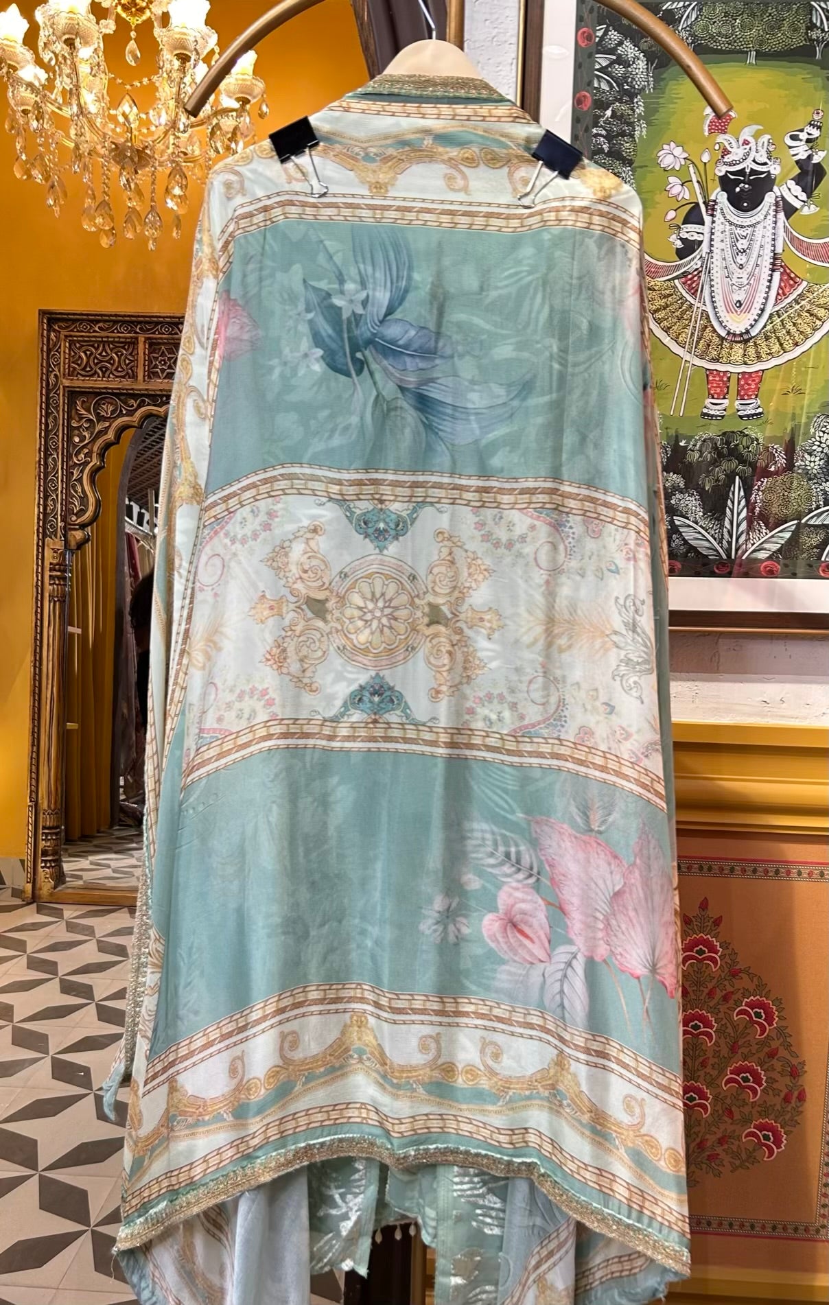 It is paired with a Pure Chinnon digital-printed dupatta, radiating grace with its fluid drape and vivid design, and a Cotton Shantoon bottom for effortless comfort.
