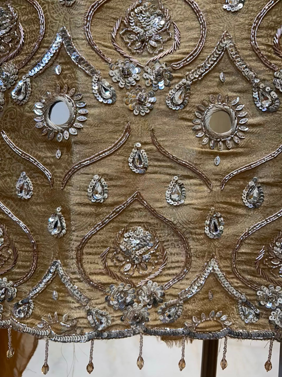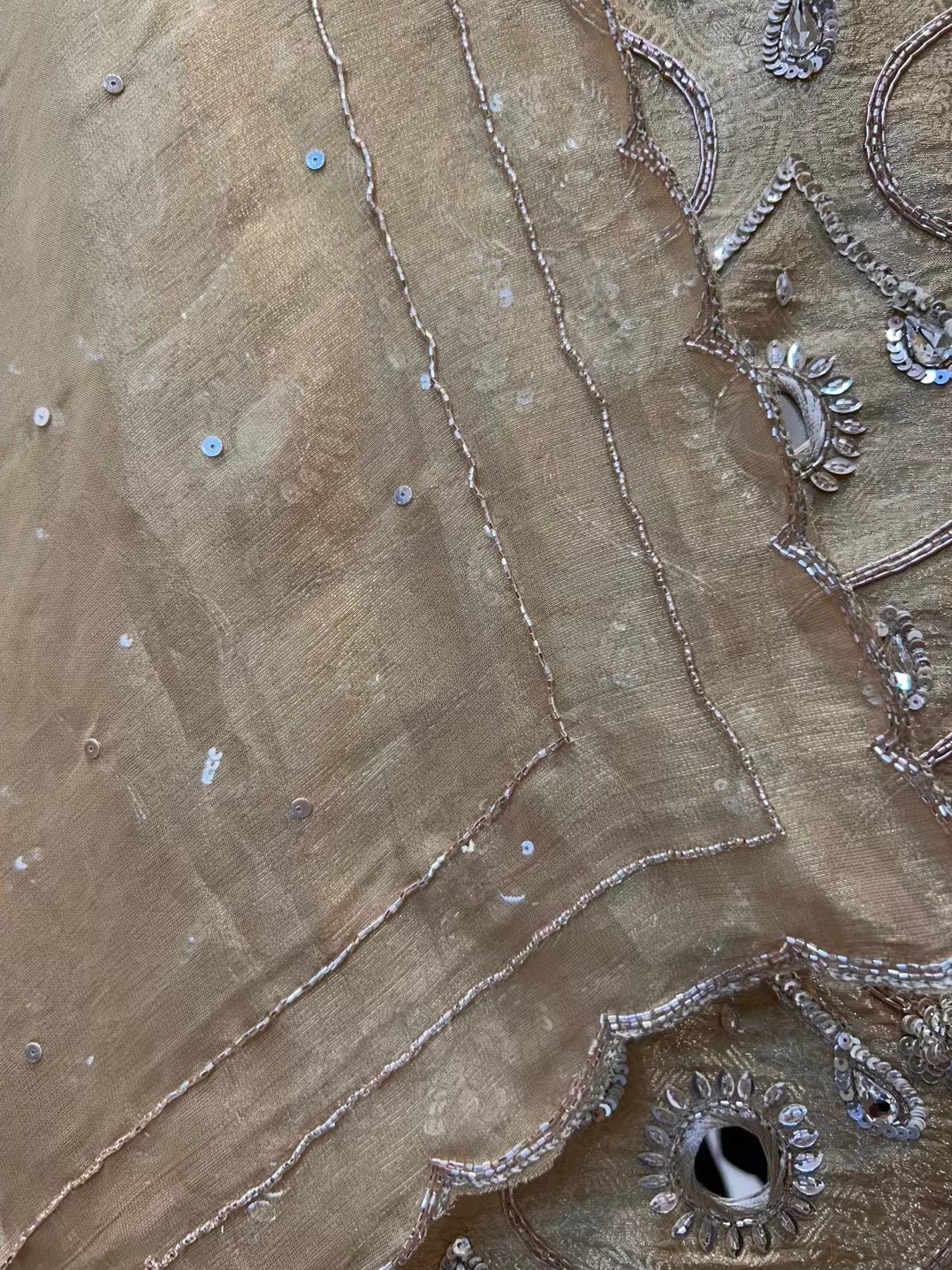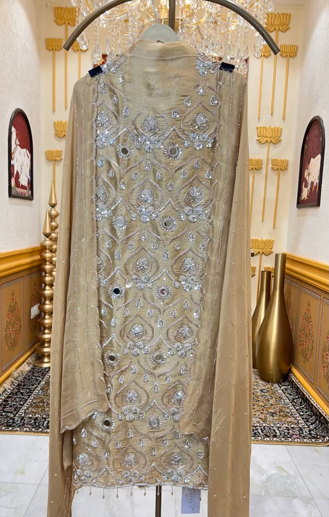 Where timeless artistry meets subtle radiance — the Zarooqía Glimmer Suit brings together the ethereal charm of shimmer organza and the finesse of intricate handwork. The all-over embroidery adds a soft, luminous texture, creating an ensemble that sparkles with understated elegance. Paired with a delicately sequinned shimmer organza dupatta and a smooth silk bottom, this suit embodies festive sophistication at its finest.