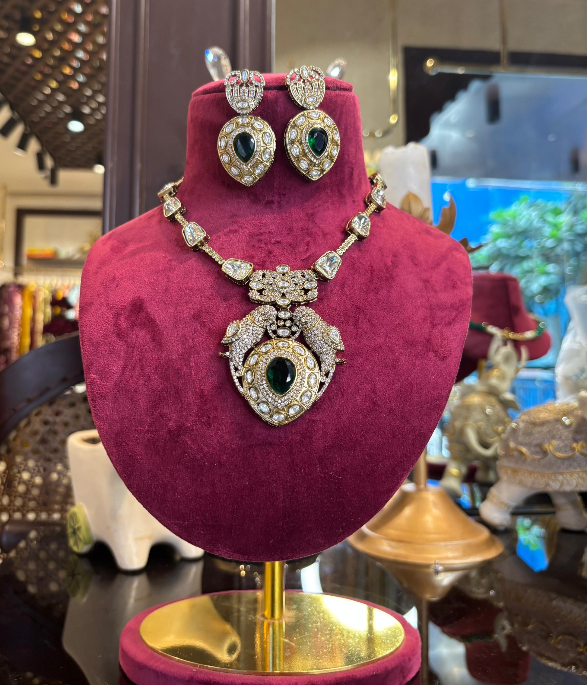 • Statement Necklace – Handcrafted with uncut polki-inspired stones, emerald accents, and peacock motifs that exude royal charm.