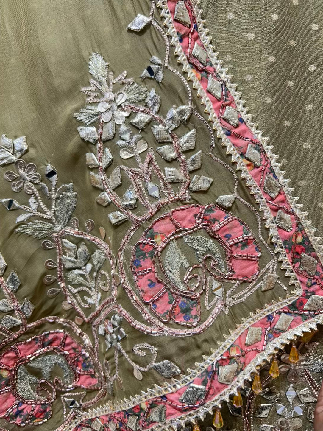 The look is completed with an elegant organza dupatta, detailed with mirror work along a four-side border, adding definition and festive charm. Paired with a smooth silk bottom, this ensemble balances tradition and elegance with effortless grace.