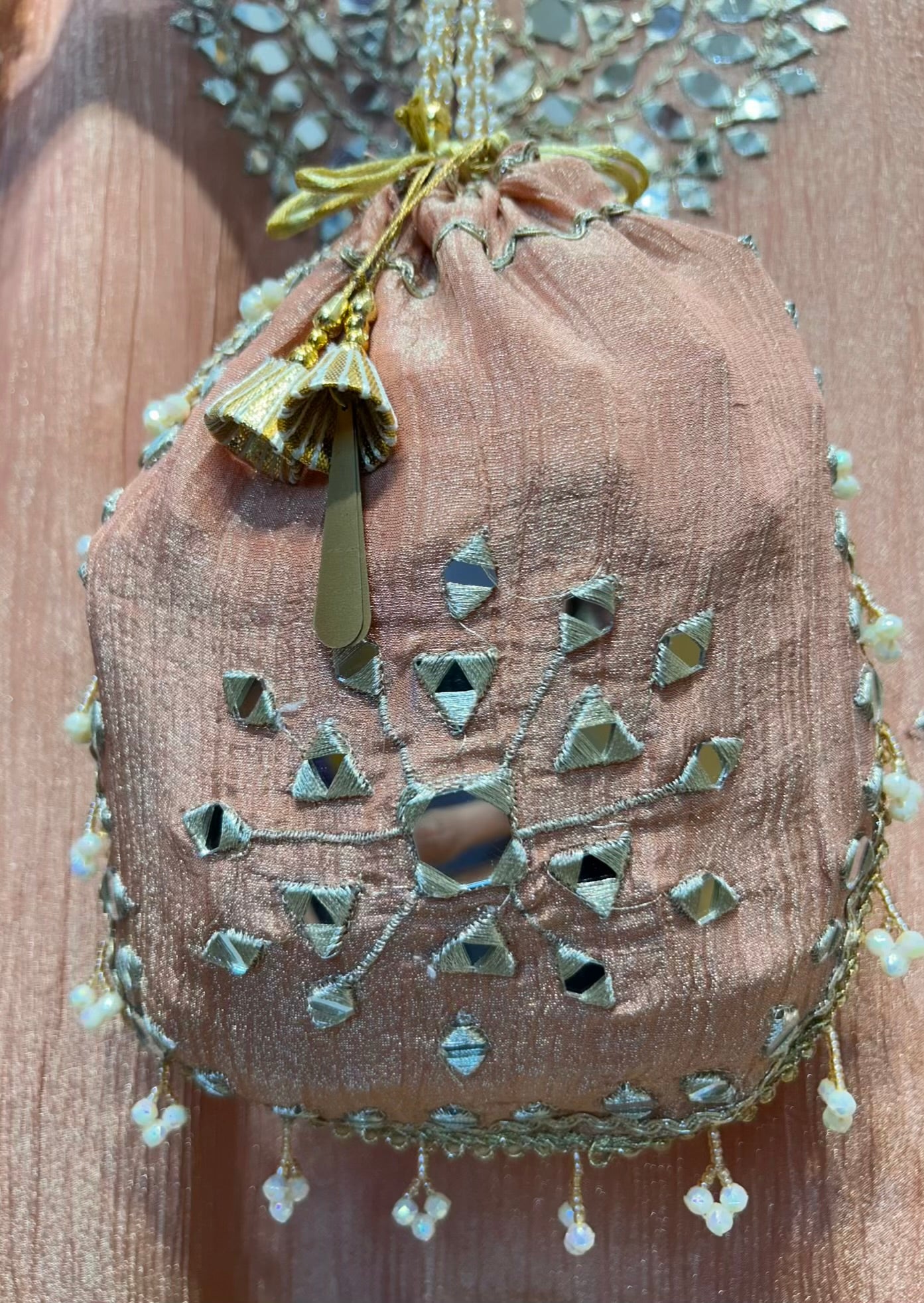 - Handcrafted Potli – Finished with mirror detailing to complete the ensemble.