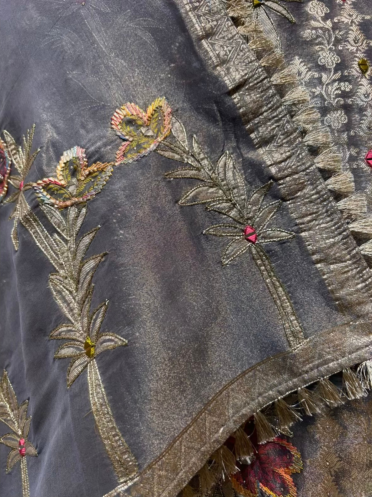 - Shimmer Organza Dupatta (2.25 mtrs) – Highlighted with four-side Kiran kinari lace and leather work, adding depth and elegance.