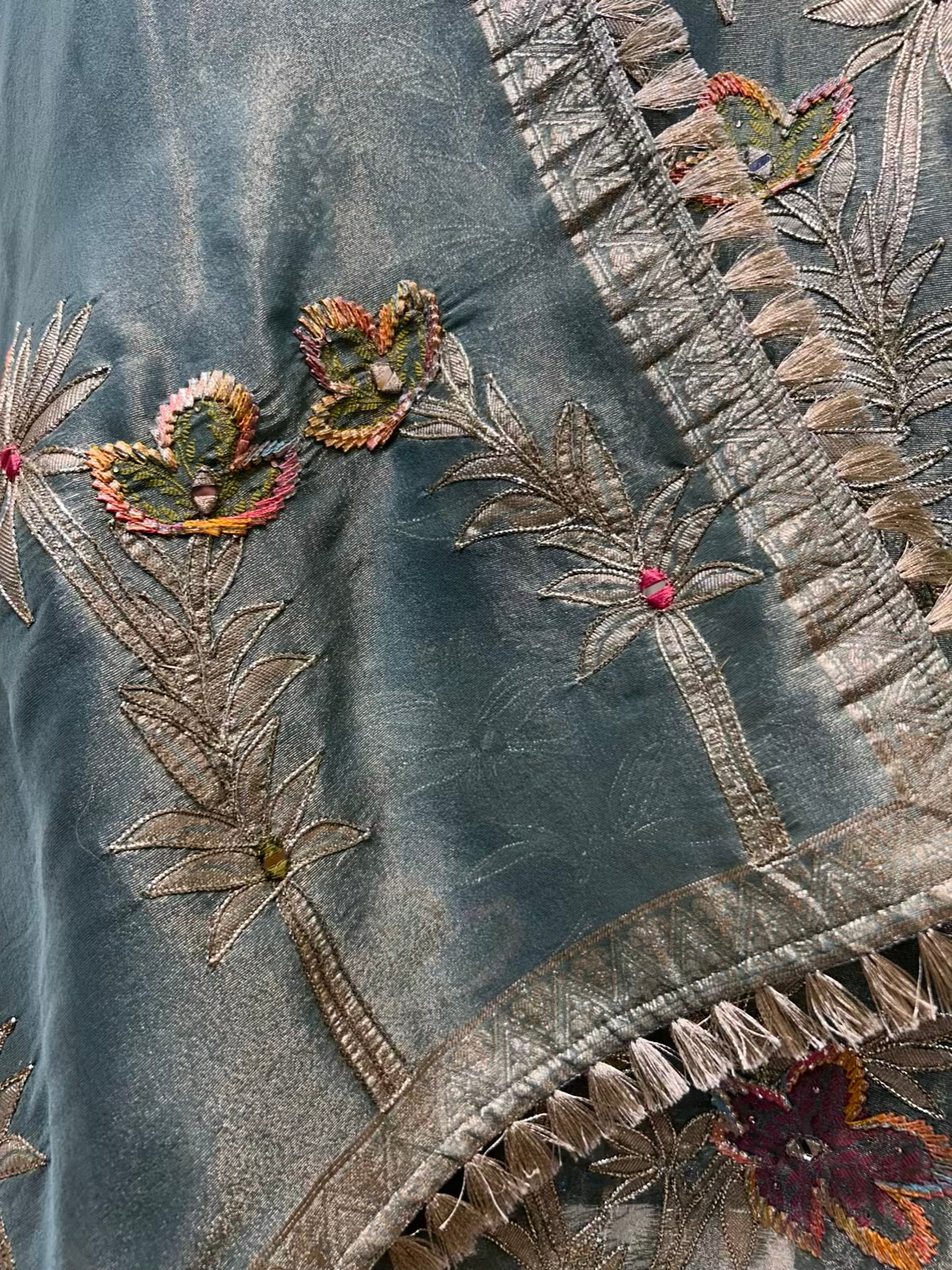 An ode to silver-toned elegance, the Zarveen SilverÉlan Suit is crafted for those who appreciate modern artistry woven into classic silhouettes. The shimmer organza suit is delicately adorned with silver zari embroidery and subtle leather detailing, creating a striking balance of softness and structure. Every element reflects thoughtful craftsmanship and understated luxury.