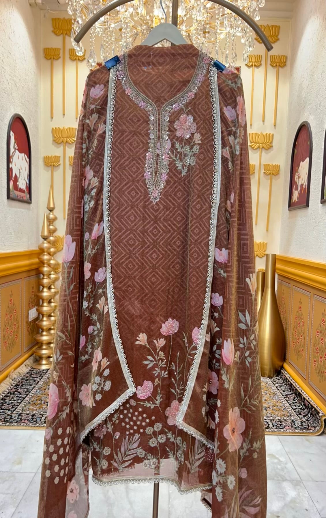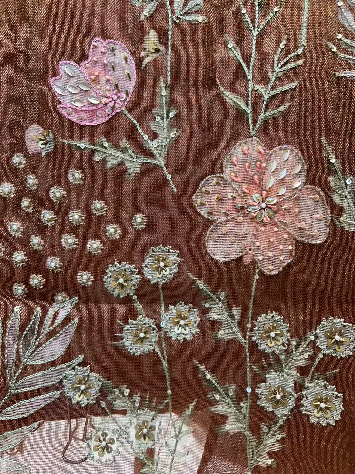 - Shimmer Organza Suit (2.5 mtrs) – Handprinted base highlighted with sequins and thread work for a luminous, detailed finish.
