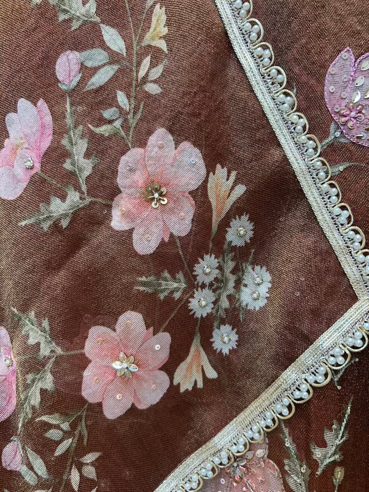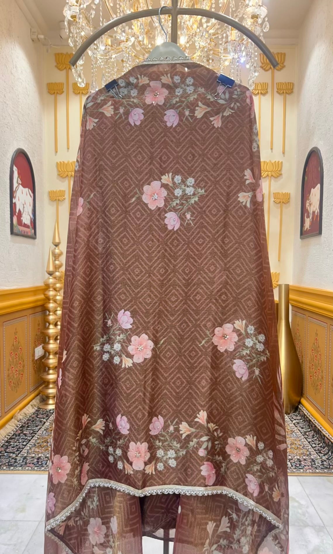 The handprinted organza dupatta, finished with an elegant four-side lace border, adds fluidity and sophistication to the ensemble while the smooth silk bottom completes the look with understated richness. Designed for women who appreciate subtle glamour and handcrafted beauty, this set is a perfect blend of tradition and contemporary finesse.