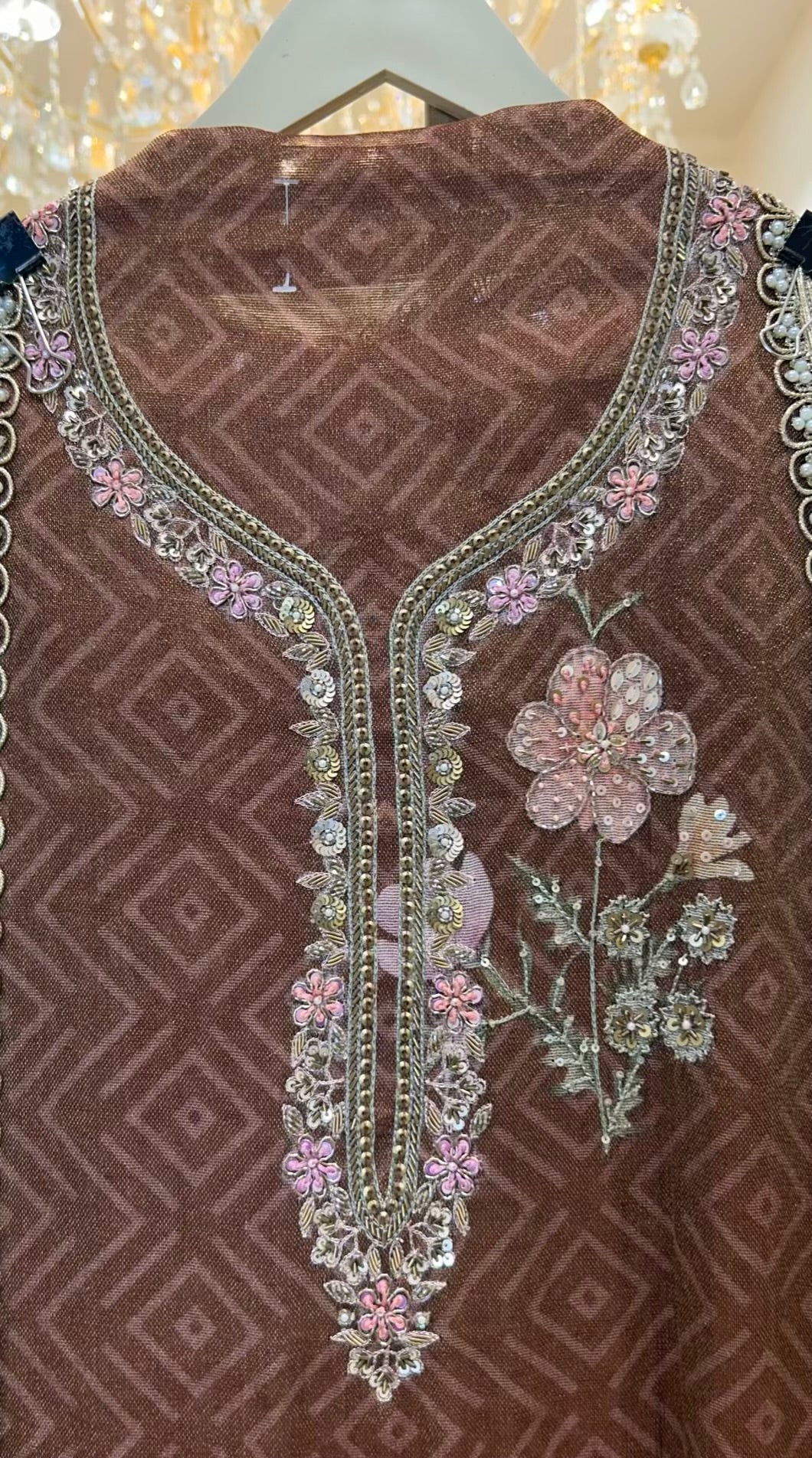 Where artistry meets effortless grace — the Zarveesha Handprint Élan Suit celebrates the charm of handprinted motifs draped over luxurious organza. Each stroke of print is enhanced with delicate sequins and thread embroidery, creating a soft festive shimmer that feels refined, graceful, and timeless.