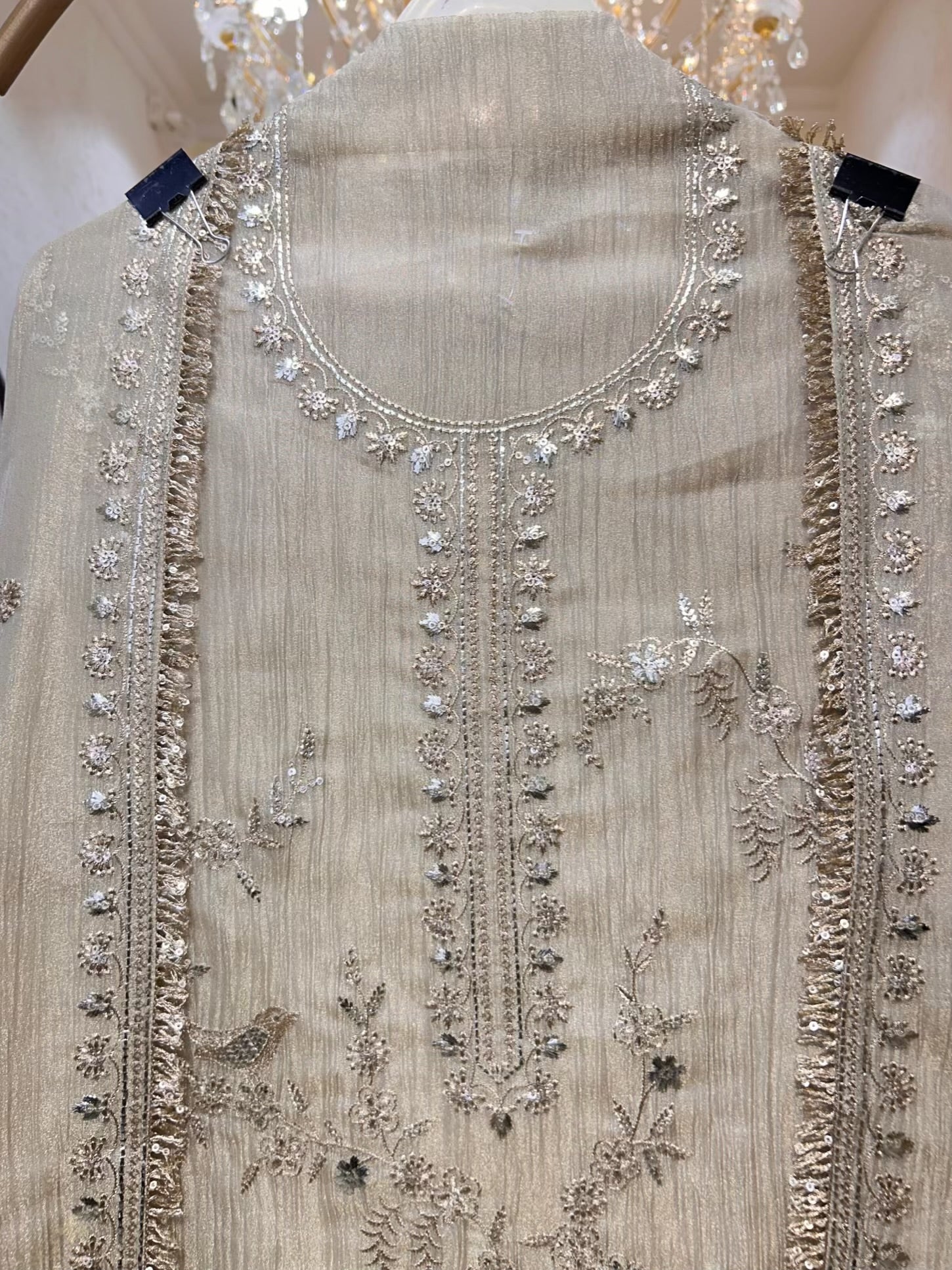 - Crush Tissue Organza Suit (2.5 mtrs) – Accented with sequins and zari work for subtle festive sparkle.