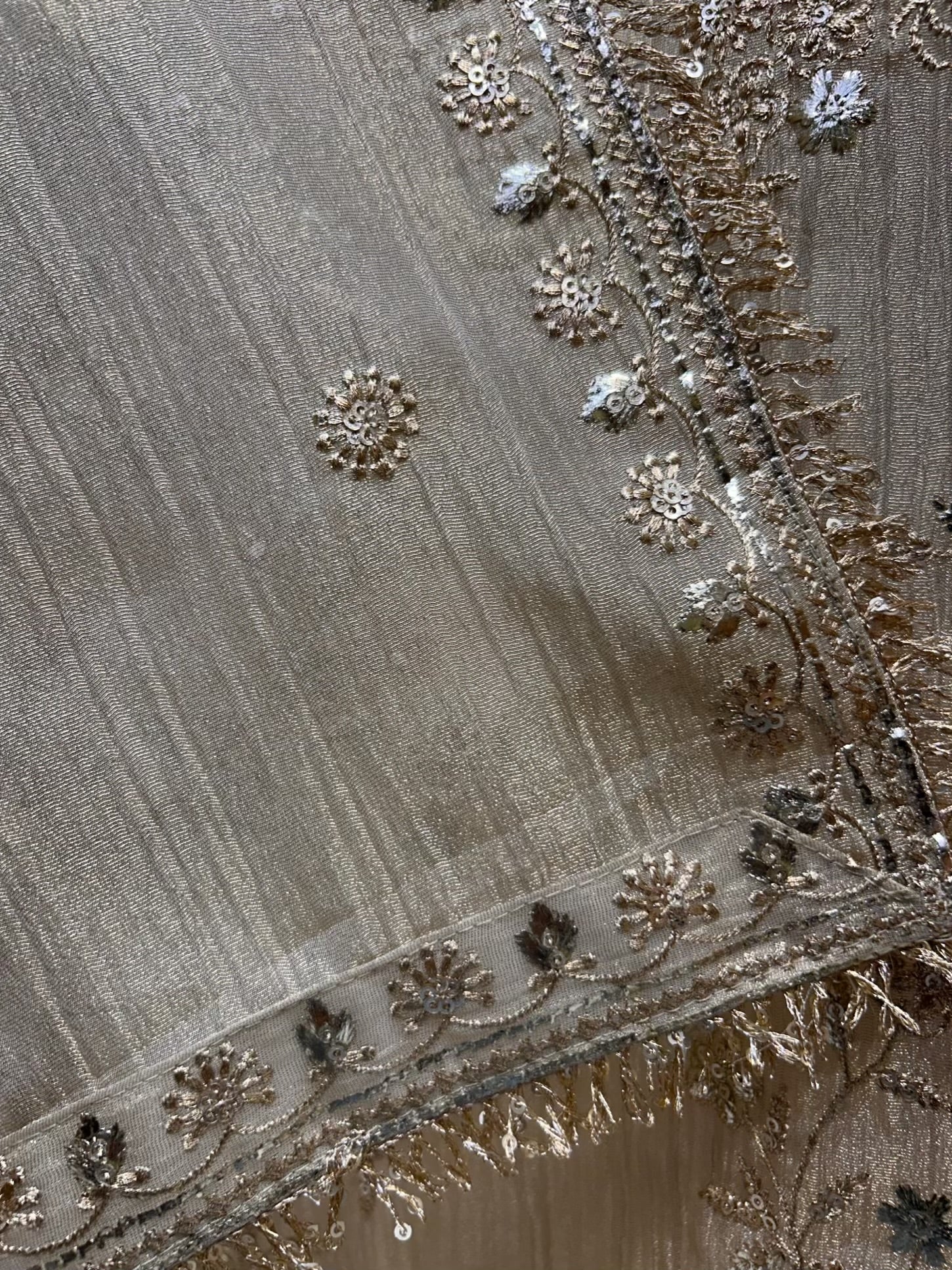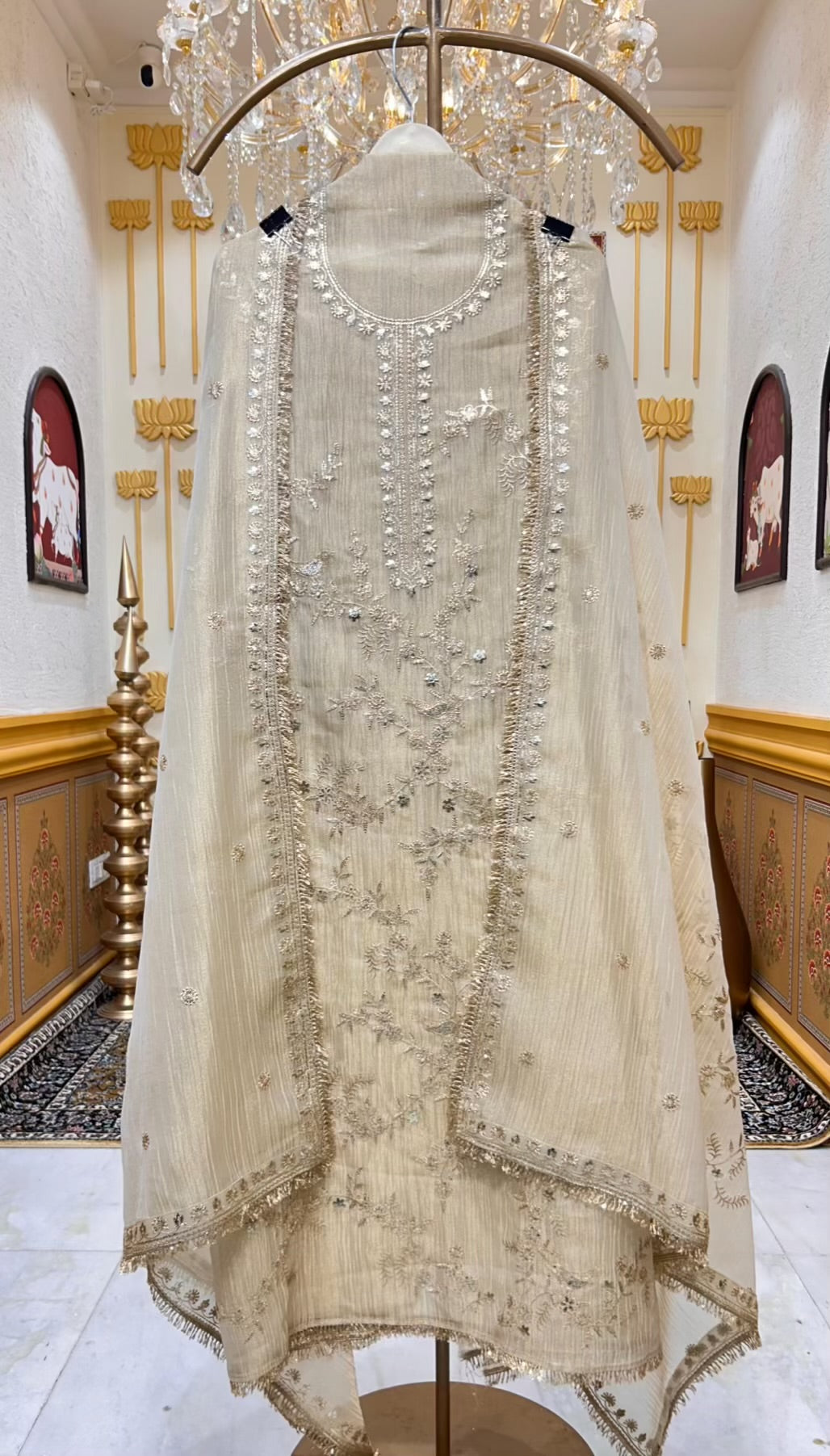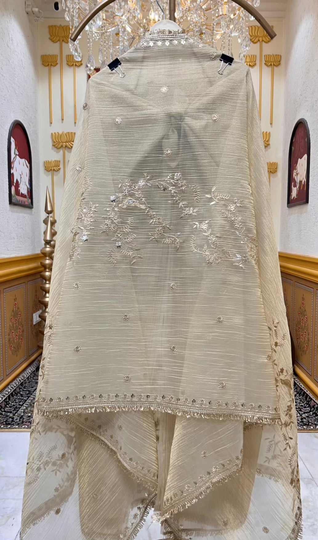 The ensemble is elevated by a matching crush tissue organza dupatta, finished with a four-side kiran kinari lace that frames the look with traditional elegance. A smooth silk bottom completes the set, adding balance, comfort, and timeless polish.