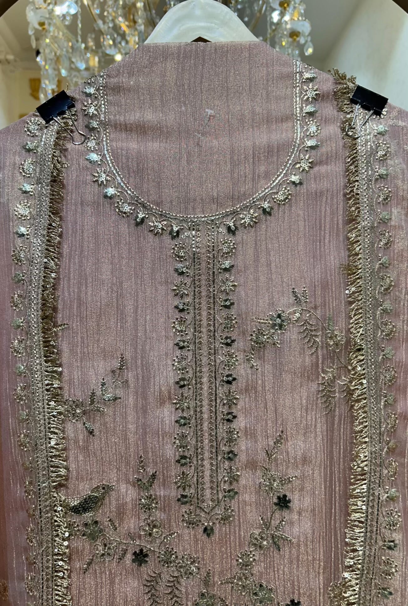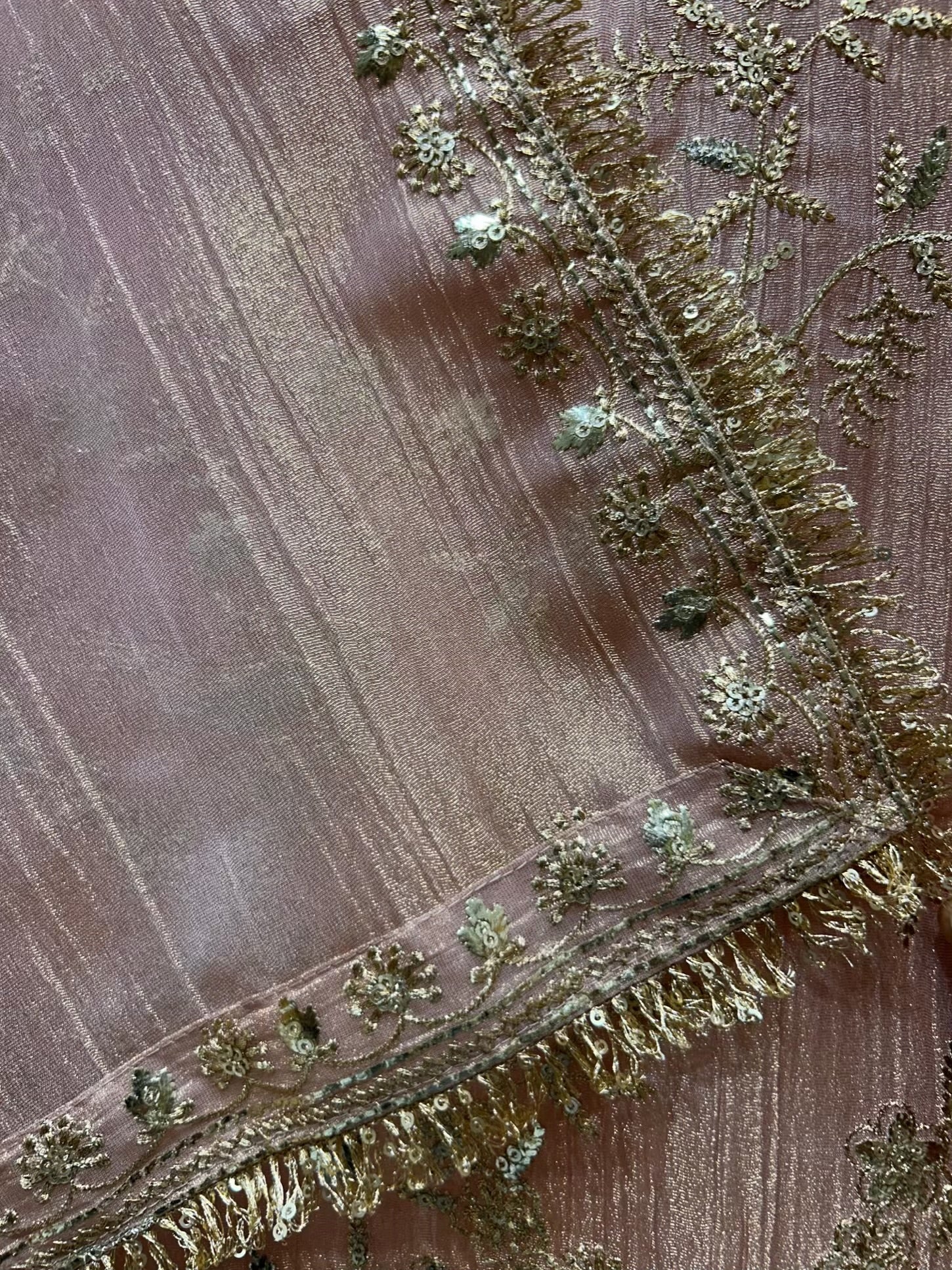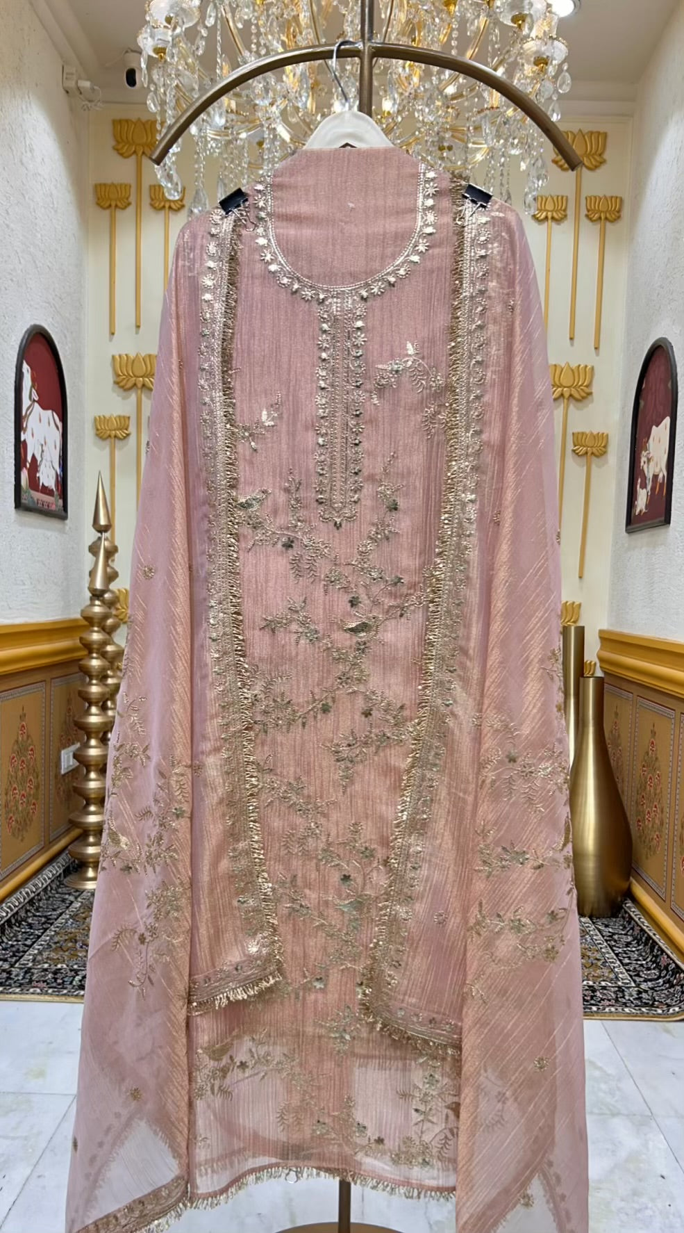 The ensemble is elevated by a matching crush tissue organza dupatta, finished with a four-side kiran kinari lace that frames the look with traditional elegance. A smooth silk bottom completes the set, adding balance, comfort, and timeless polish.