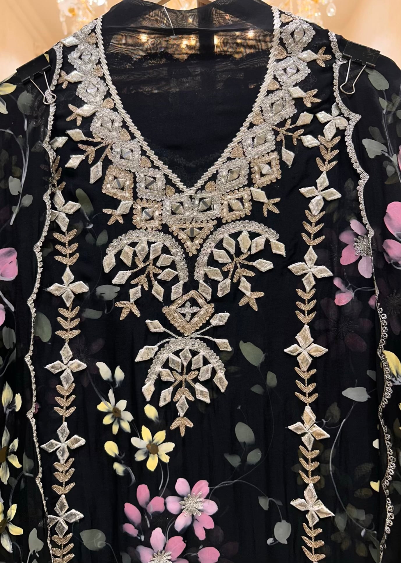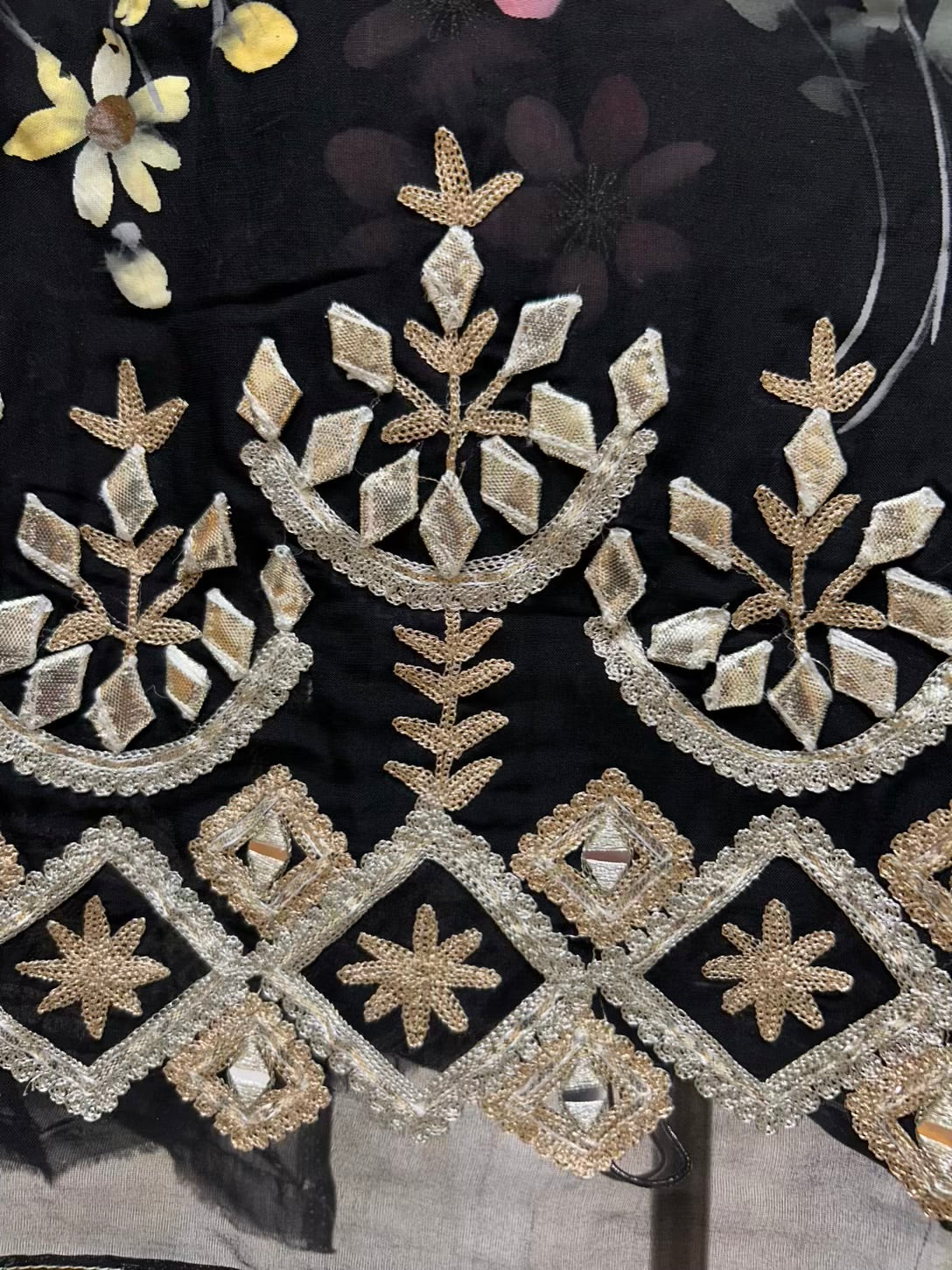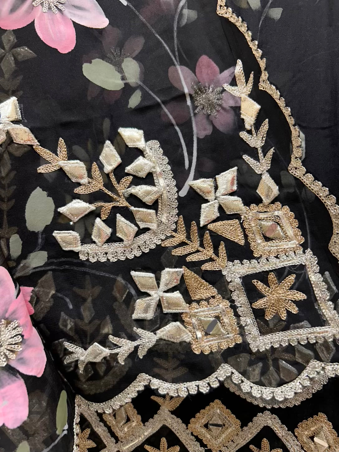 A celebration of heritage craft and contemporary charm — the Zayrika Handprint Gota Suit brings together artisanal handprinting, real mirror accents, and intricate gota detailing in a beautifully balanced ensemble. The organza suit features handprinted motifs that feel both timeless and refreshing, elevated further with delicate mirror and gota work for a festive luminance. Paired with a coordinating handprinted dupatta finished with matching embellishments and a smooth silk bottom, this set blends grace, versatility, and festive elegance.