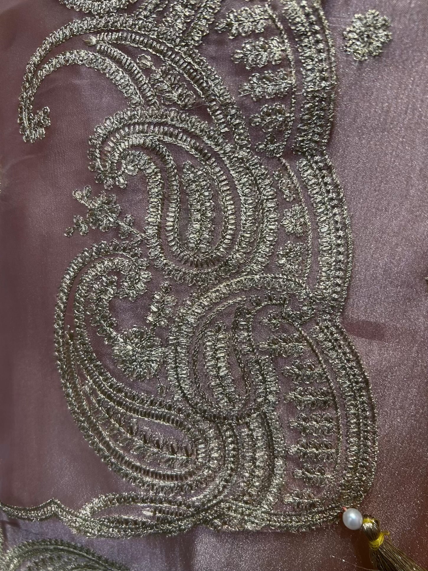 Where luminosity meets timeless artistry — the Zehnara Tissue Organza Suit captures the ethereal beauty of zari craftsmanship on a gleaming organza base. The tissue organza shirt, delicately woven with fine zari work, radiates an understated sheen that feels both regal and graceful. Paired with a matching dupatta adorned with a four-side zari border and a smooth silk bottom, this ensemble is a tribute to refined luxury and effortless sophistication.