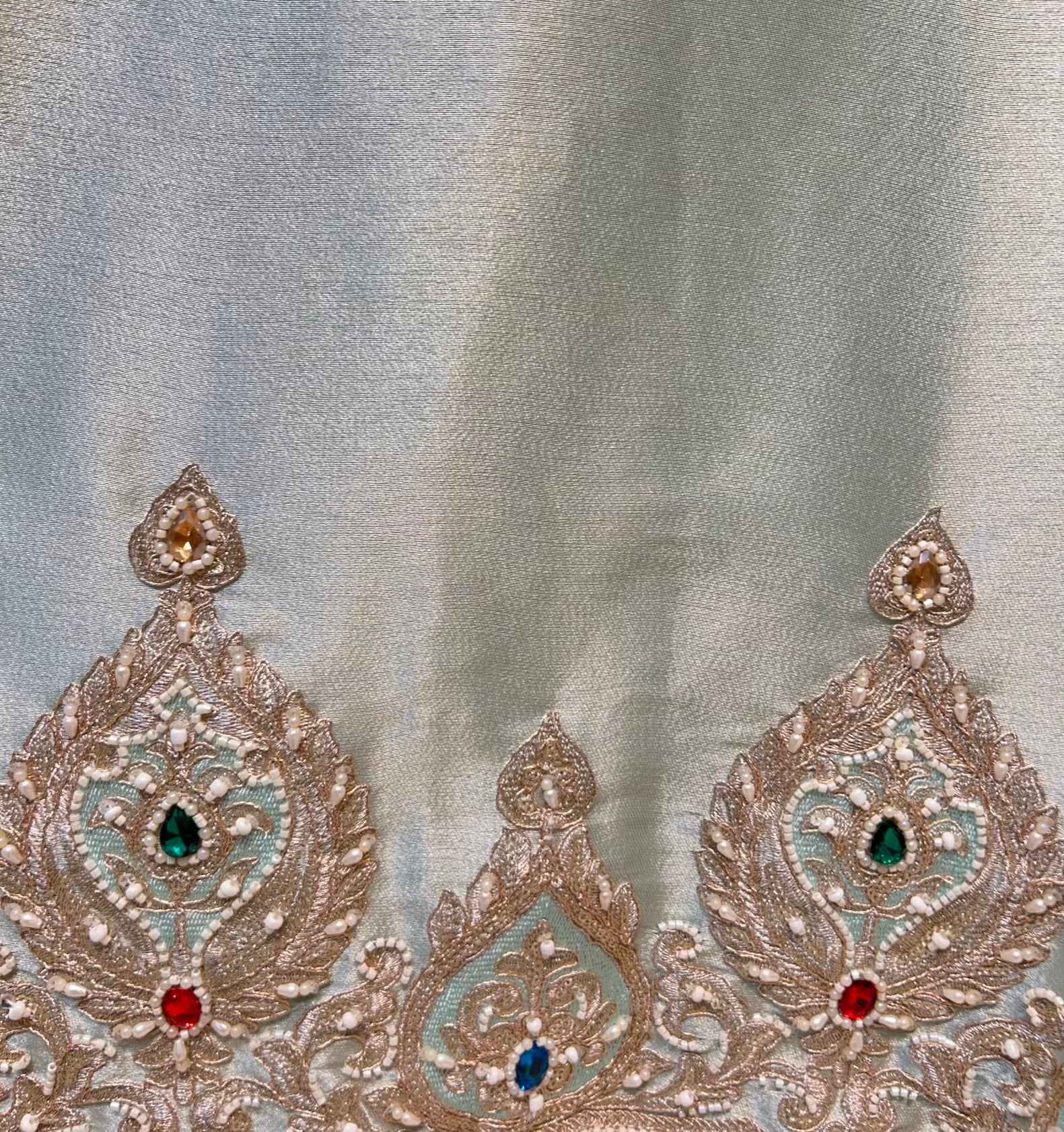 Softly radiant and timeless in appeal, the Zehraani Élan Suit is a celebration of refined elegance and delicate craftsmanship. The shimmer organza suit is adorned with intricate handwork that adds a gentle sparkle without overpowering its graceful silhouette. Paired with a fluid shimmer organza dupatta and a smooth silk bottom, this ensemble embodies understated festivity and effortless charm.