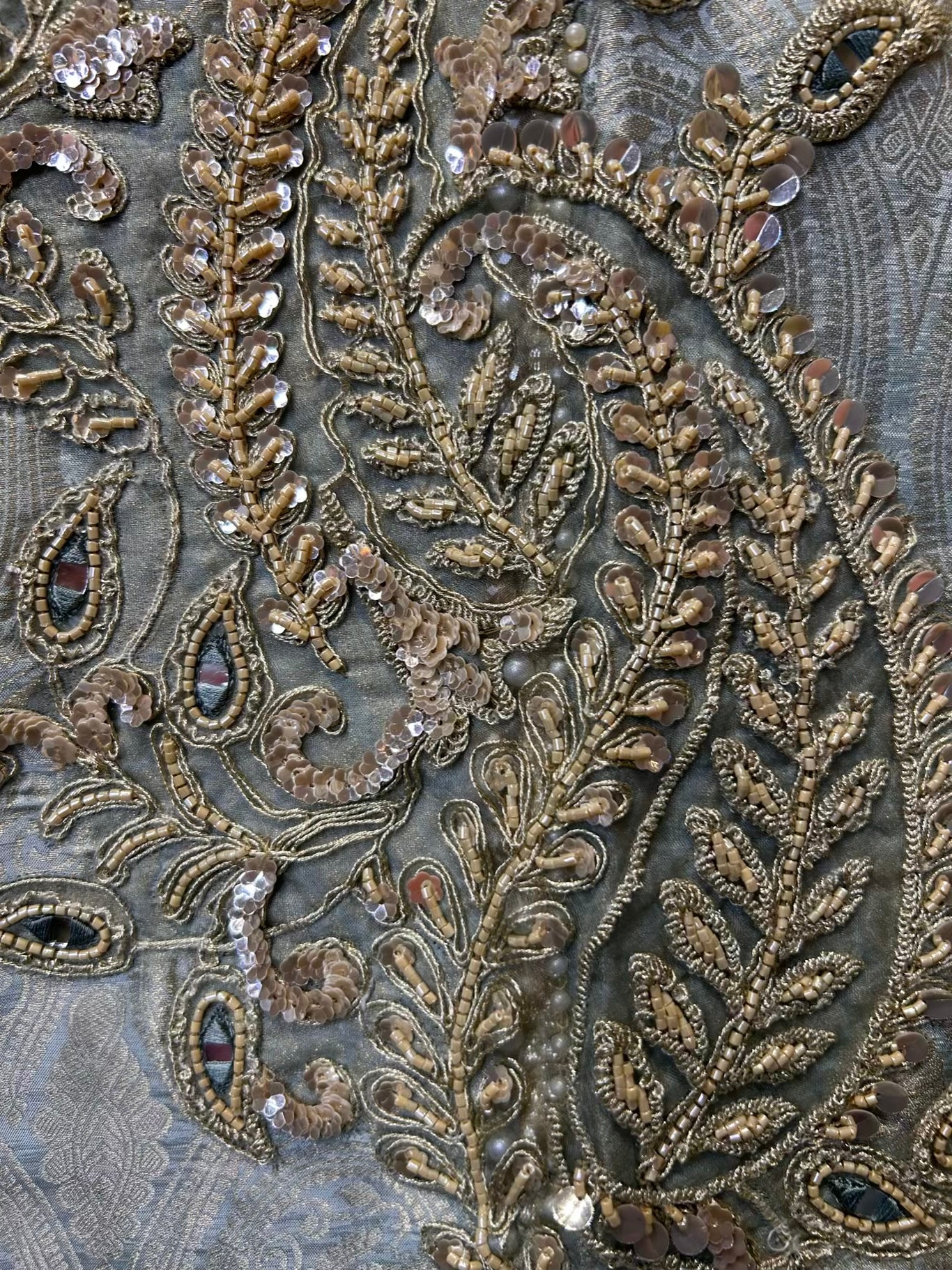 A timeless creation that balances shimmer with artistry. The shimmer organza suit, adorned with delicate handwork, radiates refined charm. Paired with a silk bottom for luxurious grace and a shimmer organza dupatta that flows with ethereal beauty, this set is a versatile addition to your festive wardrobe.