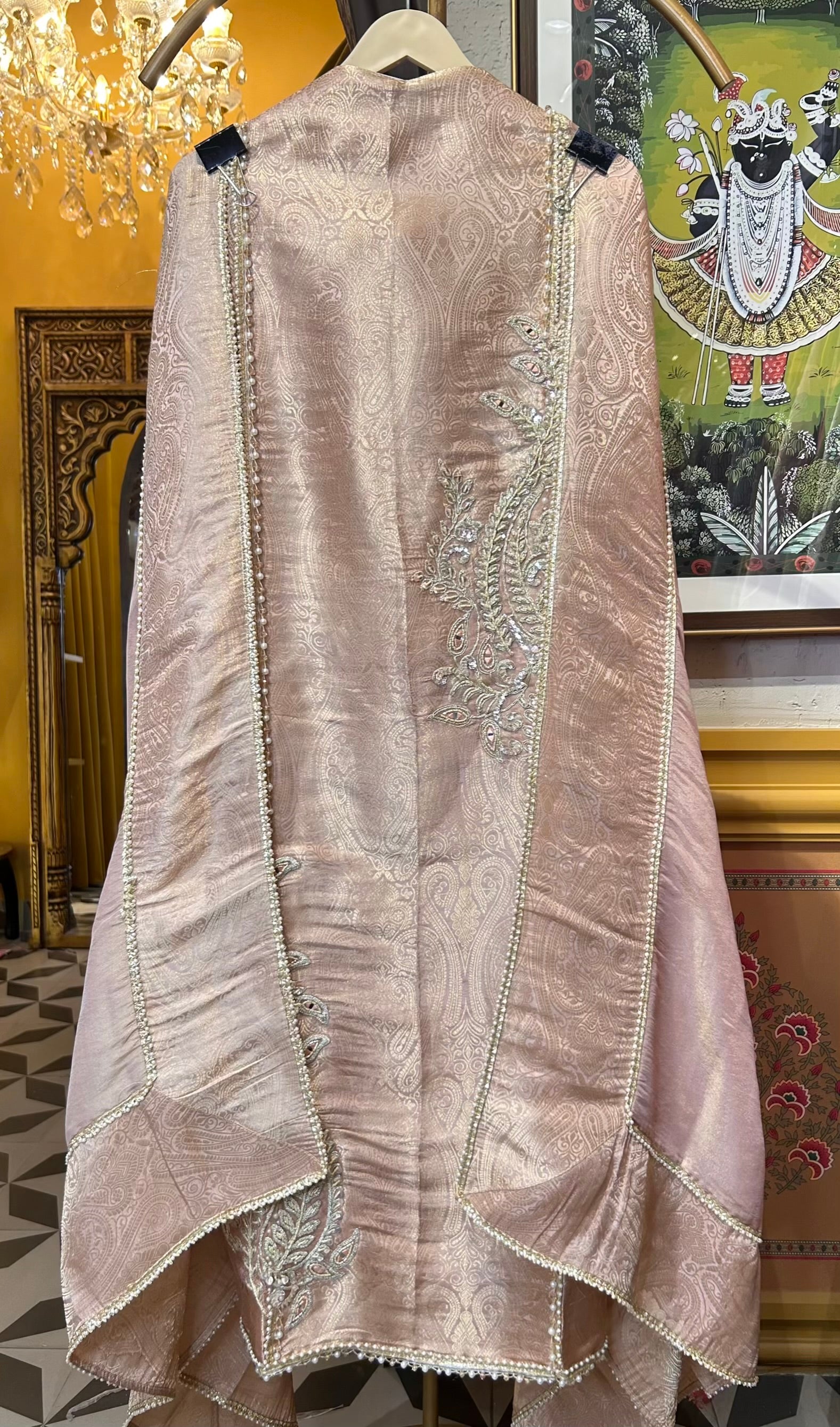 A timeless creation that balances shimmer with artistry. The shimmer organza suit, adorned with delicate handwork, radiates refined charm. Paired with a silk bottom for luxurious grace and a shimmer organza dupatta that flows with ethereal beauty, this set is a versatile addition to your festive wardrobe.