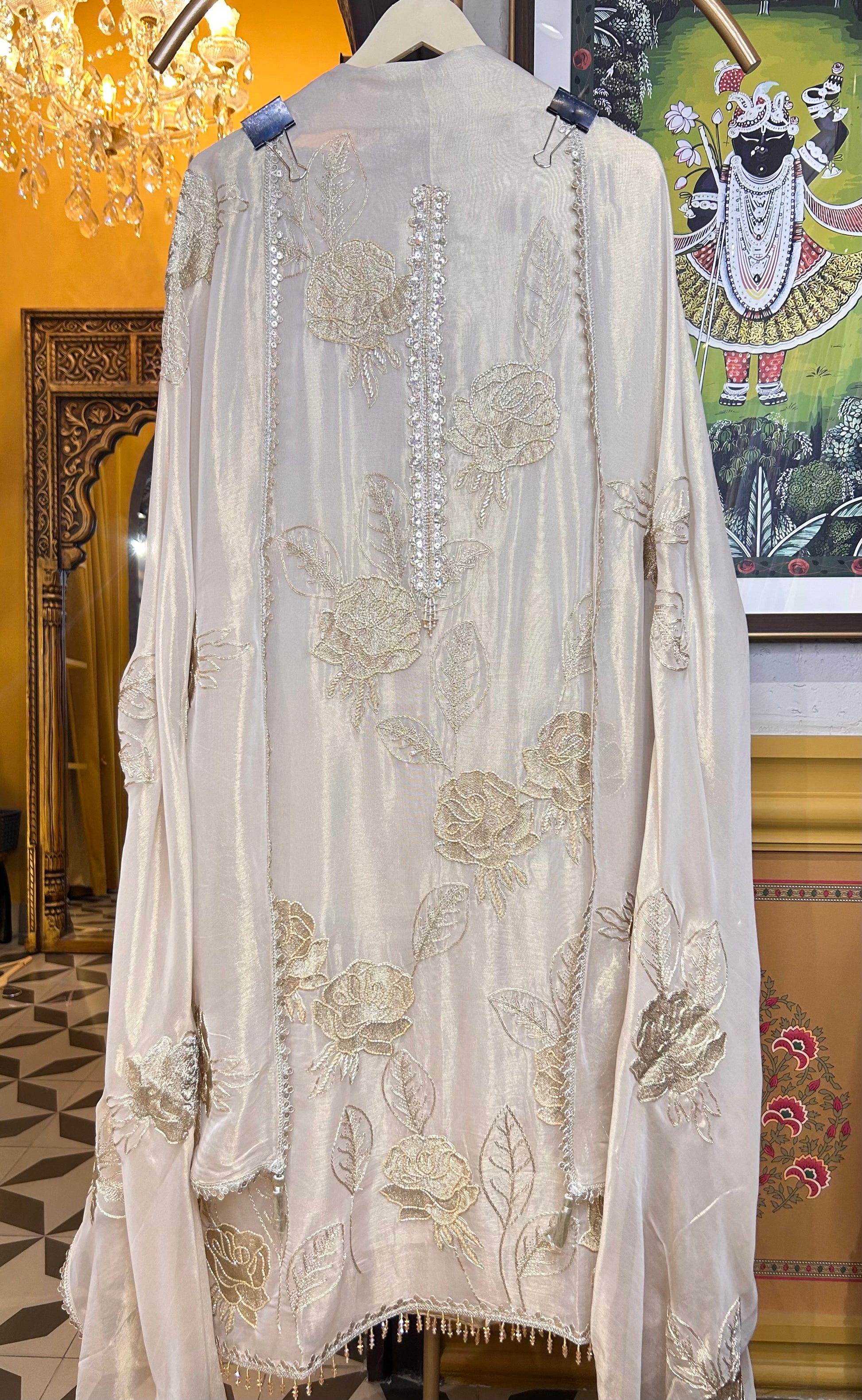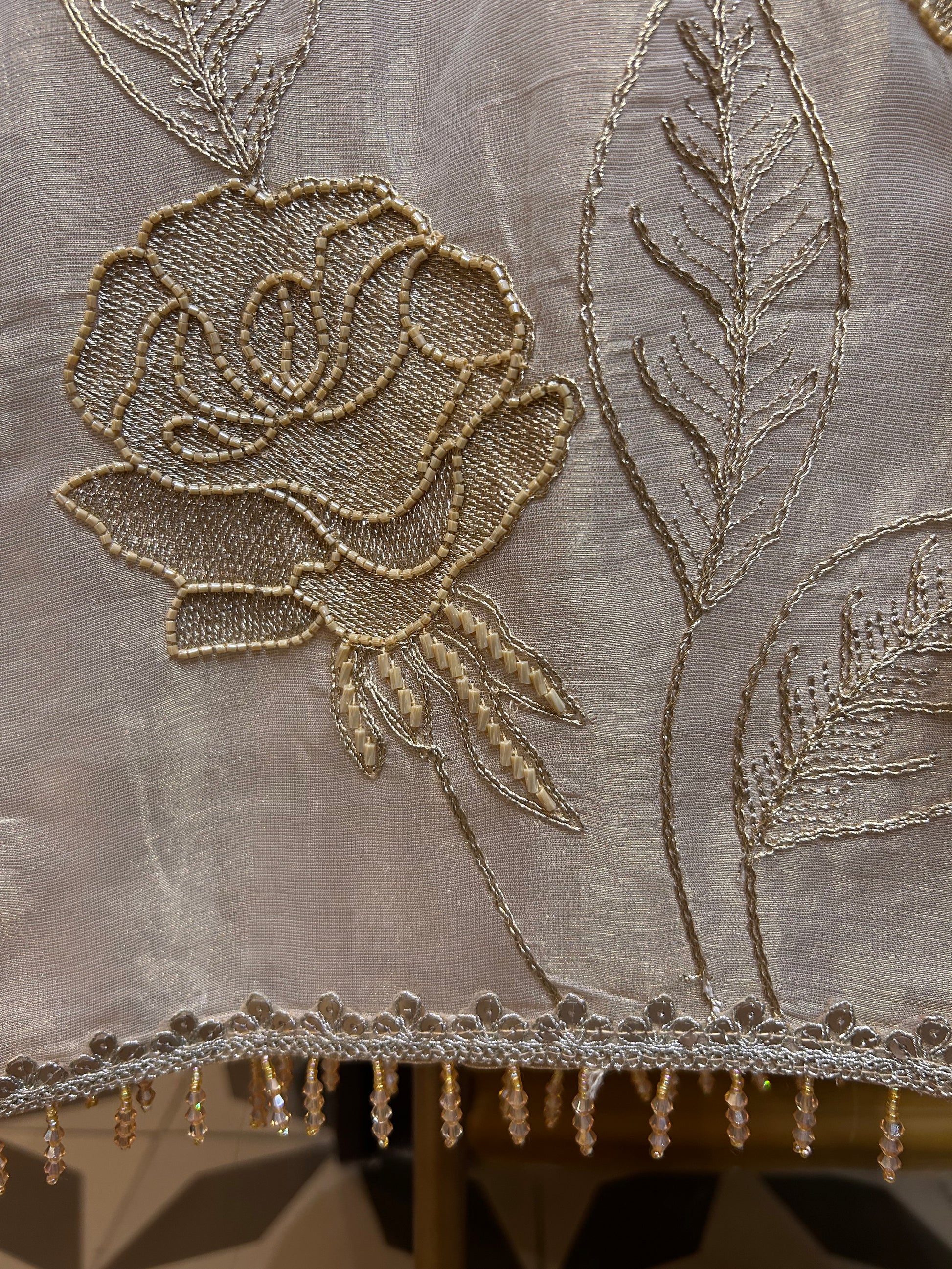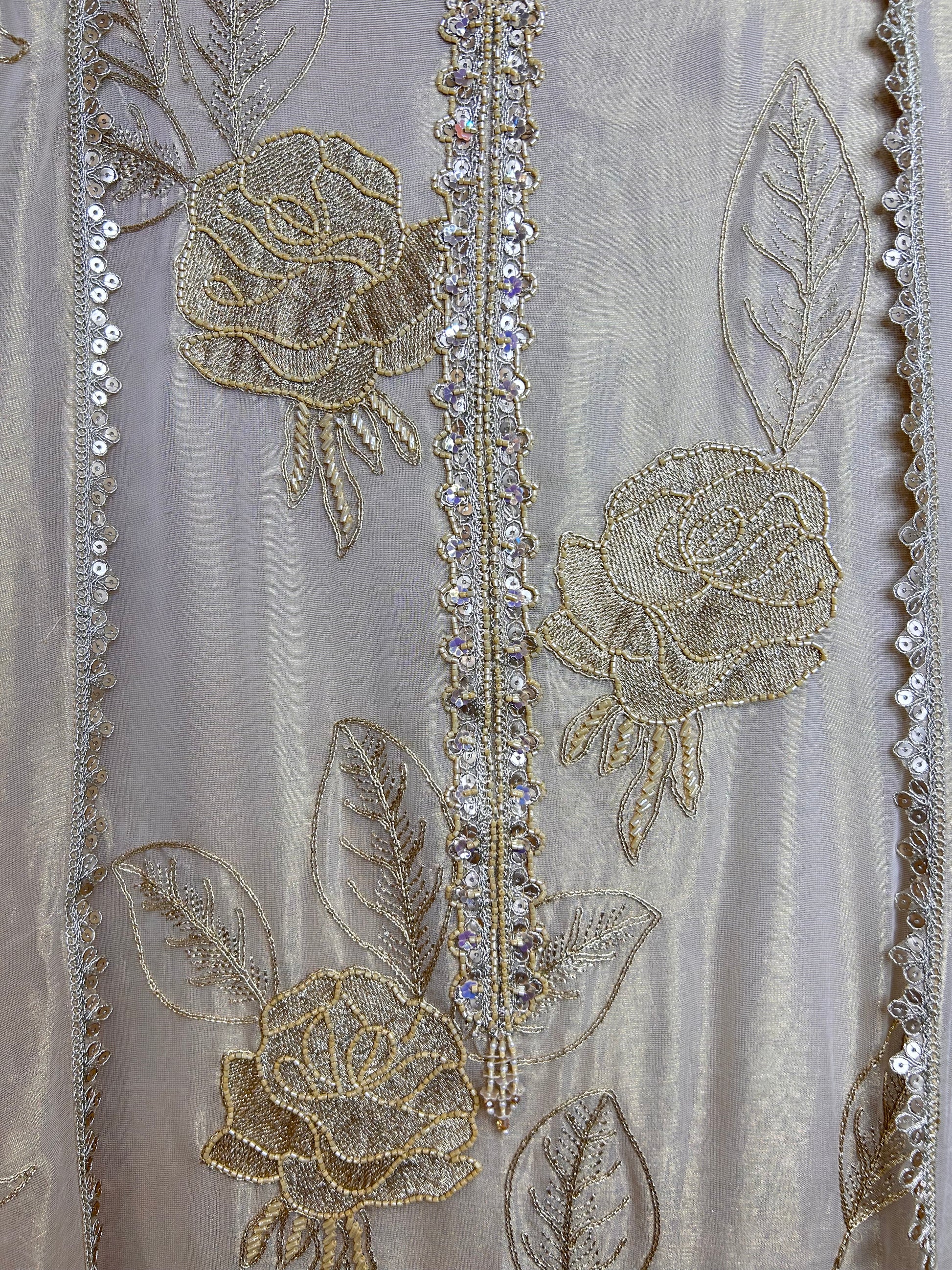 • Shimmer Organza Banarasi Shirt with Hand-Embroidered Neckline, Sequin, Cut Dana & Moti Work – 2.5 meters
