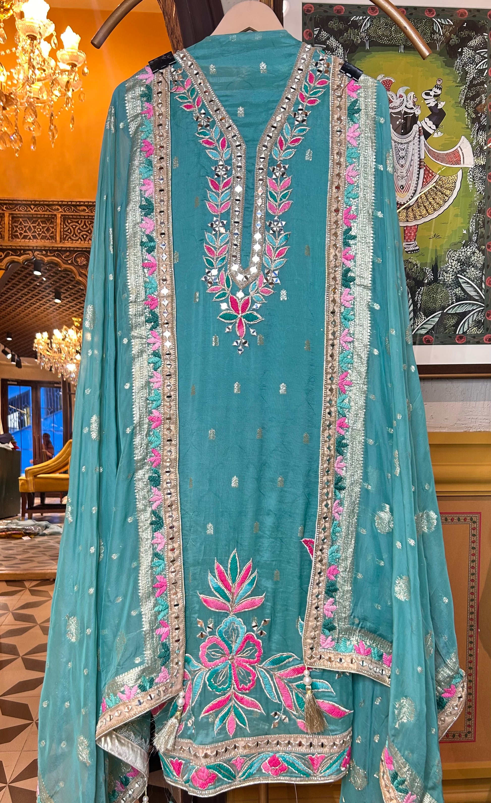 A delicate organza base, brought to life with intricate thread embroidery and luminous mirror accents, blending tradition with modern artistry.