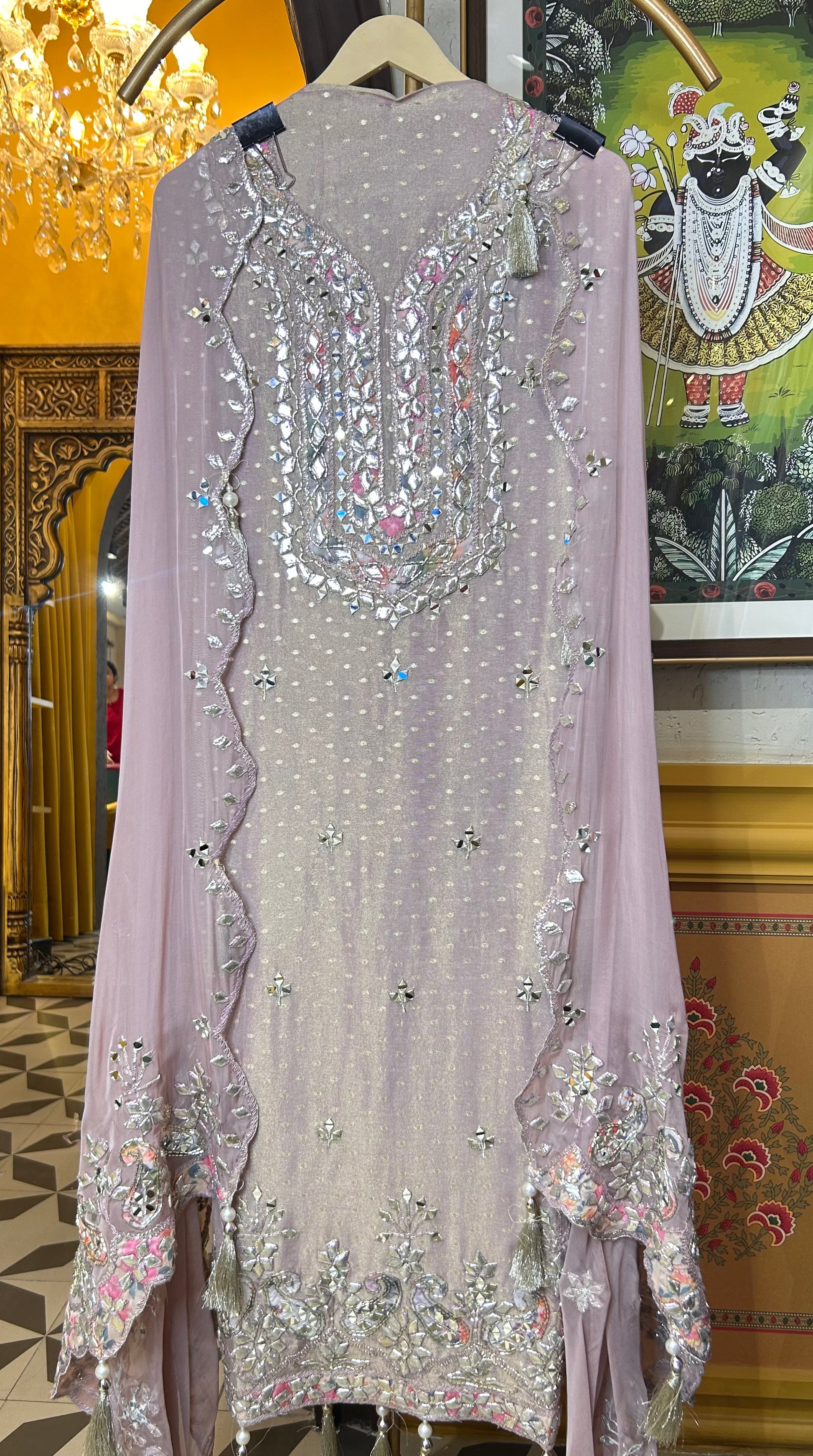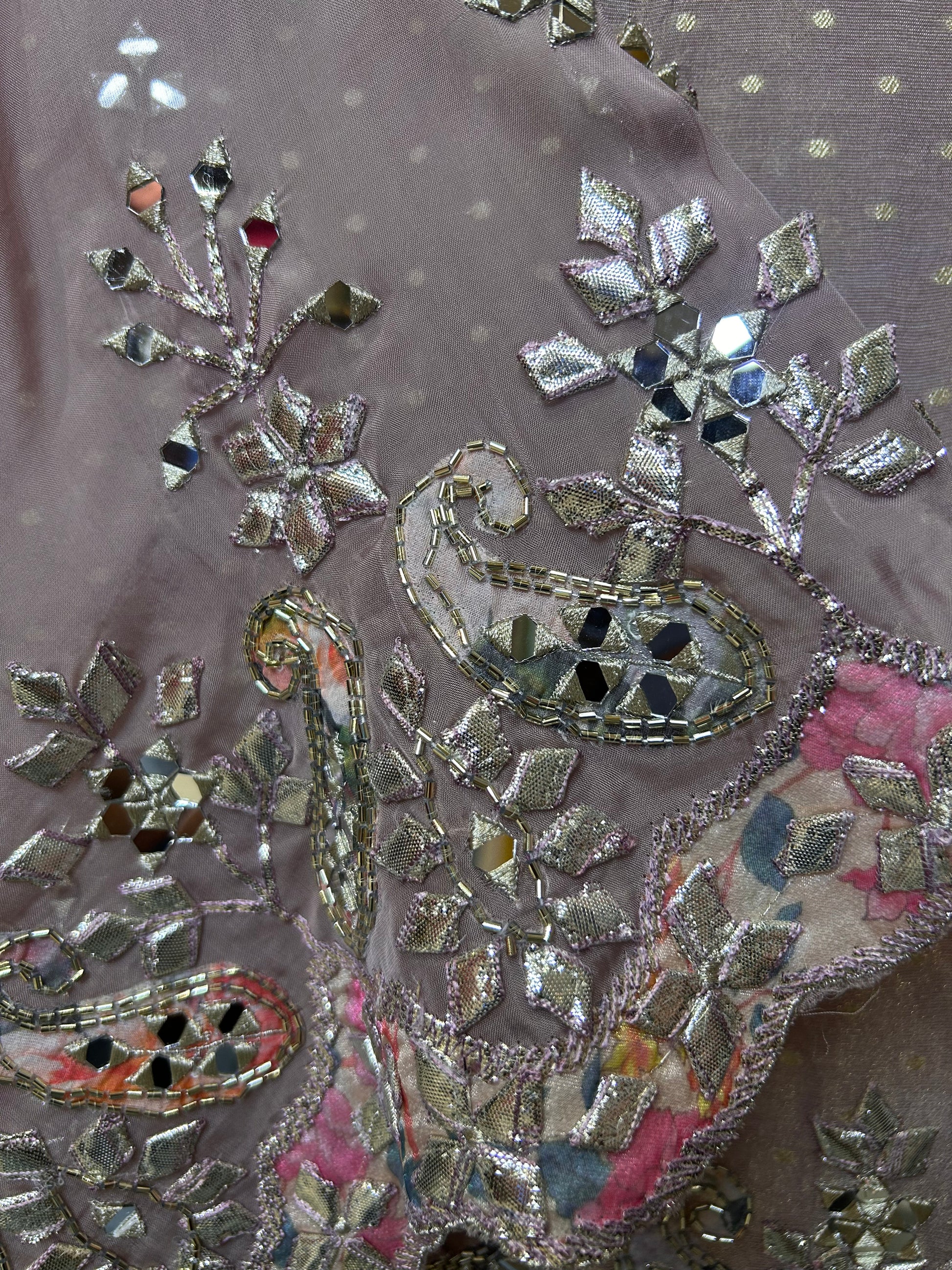 A gleaming organza base exquisitely adorned with gota, sparkling mirrors, and delicate cut dana embellishments on the neckline, creating a statement of timeless grandeur.