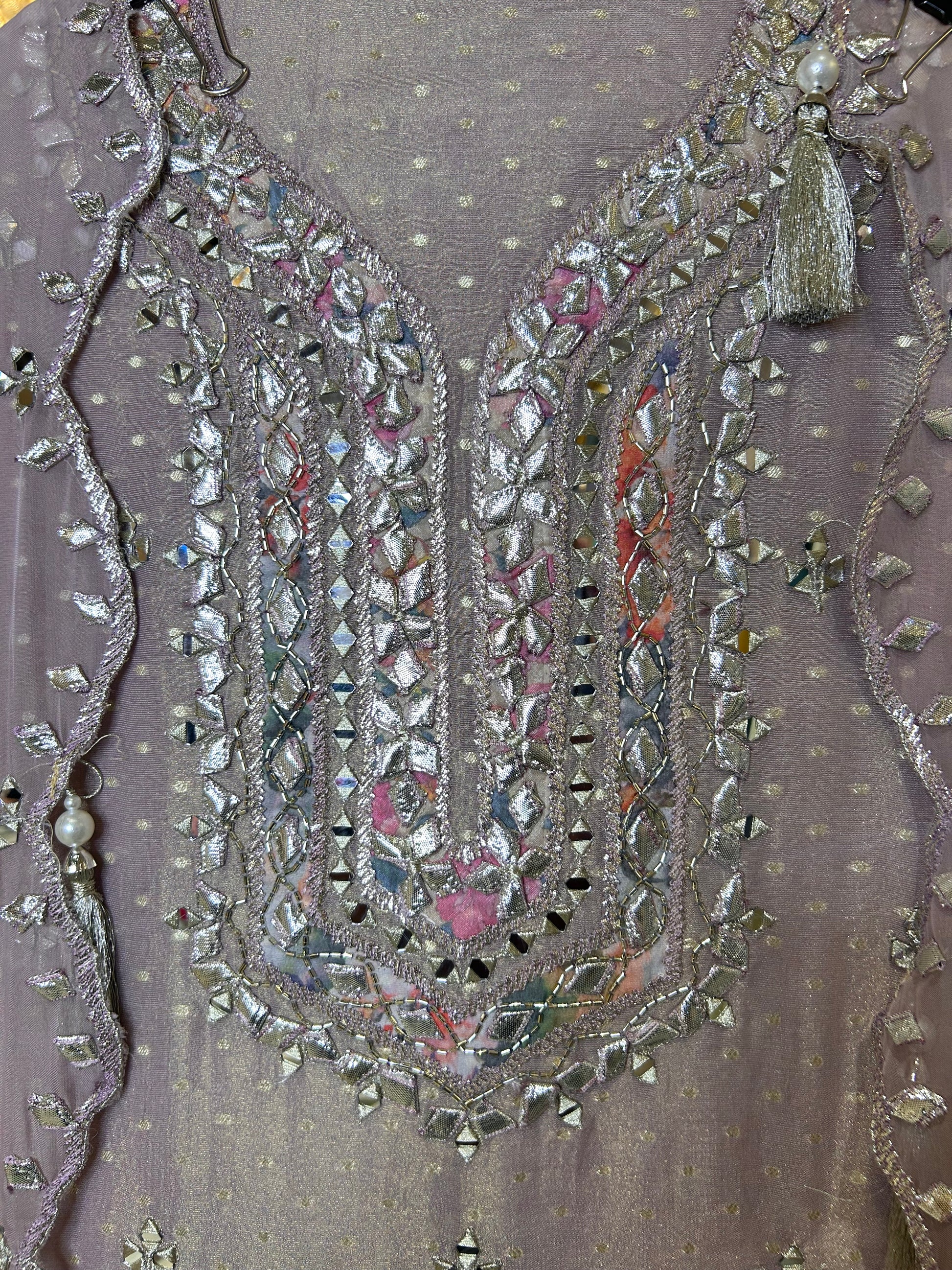 • Shimmer Organza Shirt with Neckline Gota, Mirror & Cut Dana Work – 2.5 meters