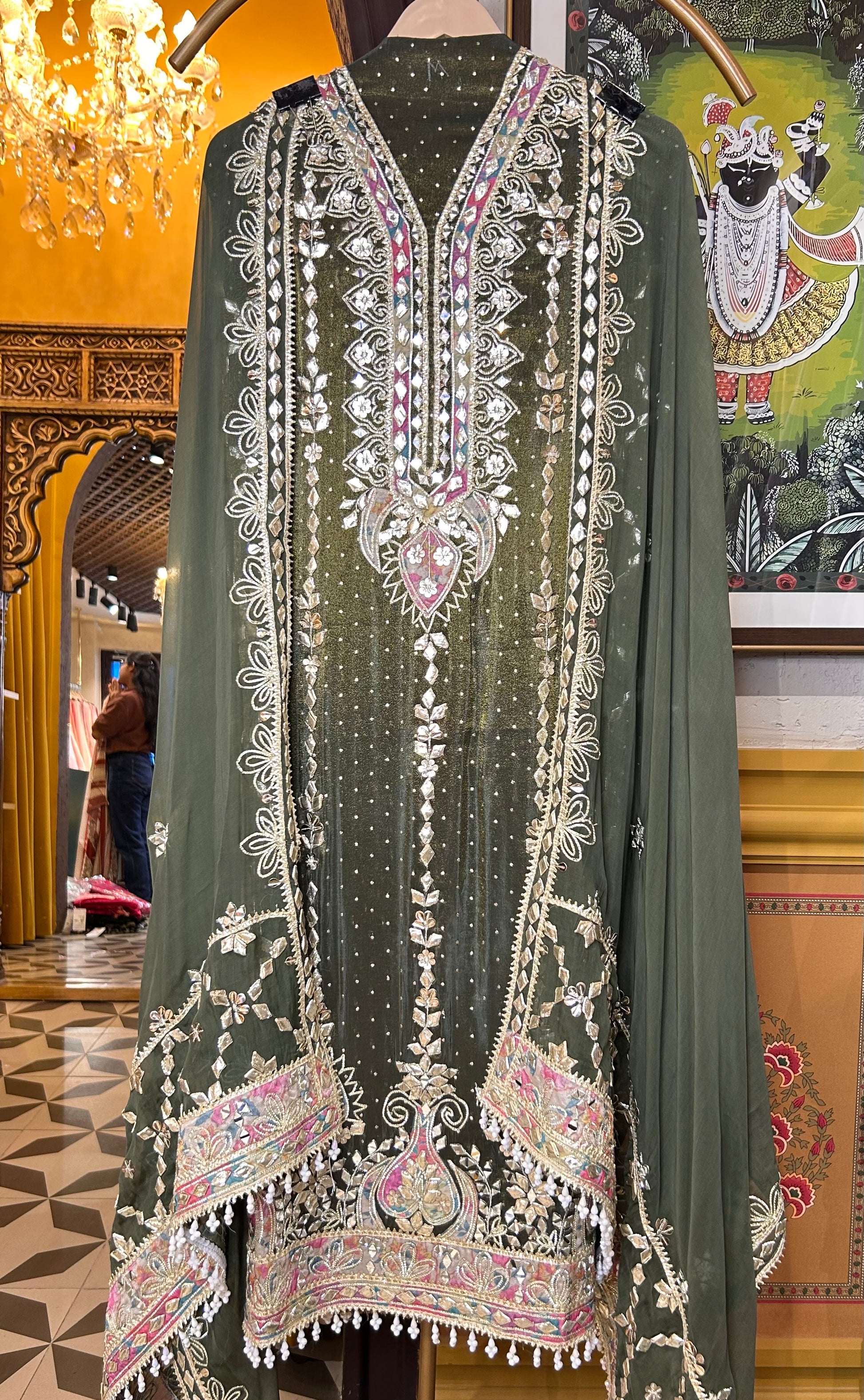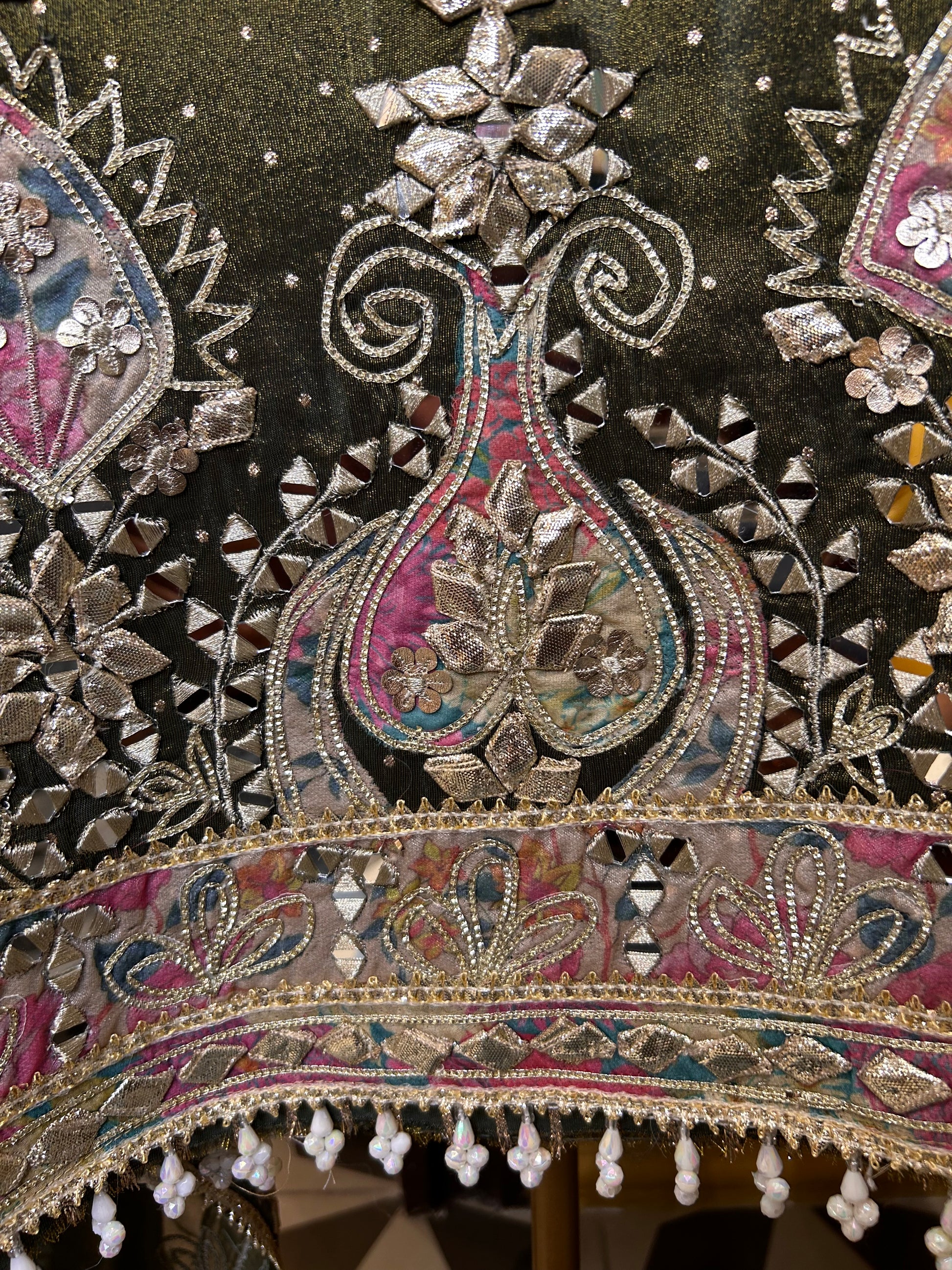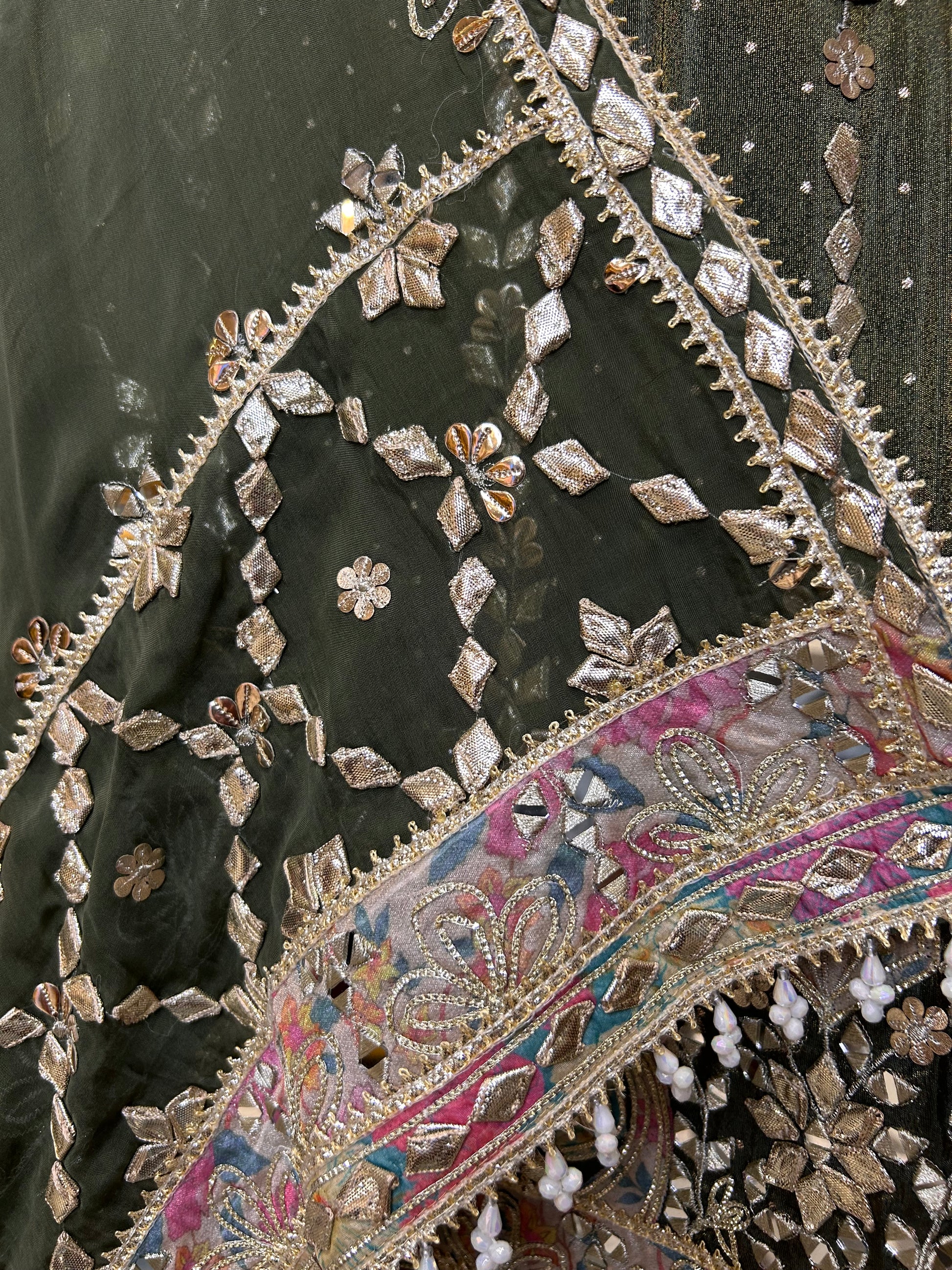 A delicate organza base, elevated with intricate gota and hand-set real mirror work that captures the beauty of light in every glance.