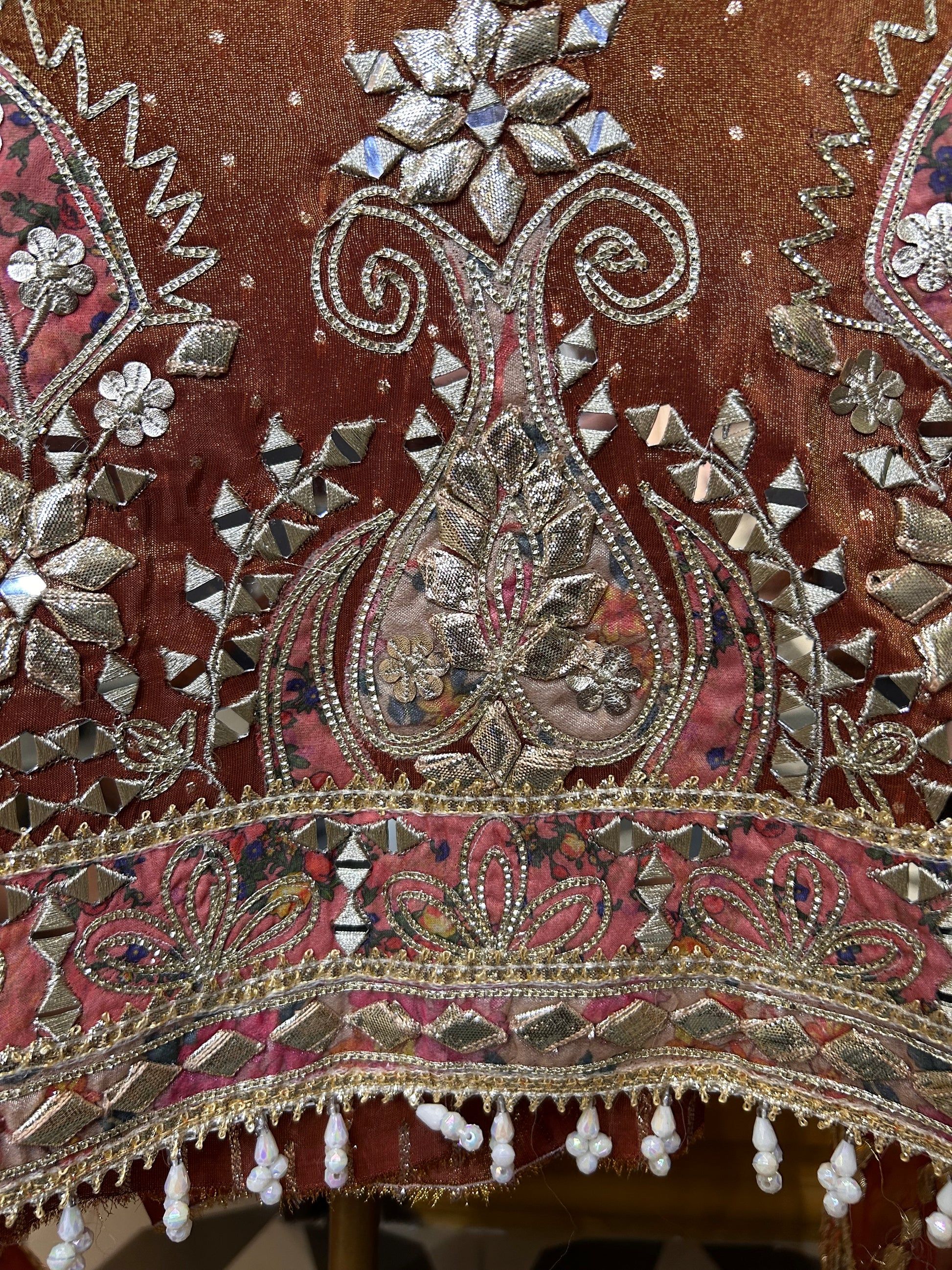 A delicate organza base, elevated with intricate gota and hand-set real mirror work that captures the beauty of light in every glance.