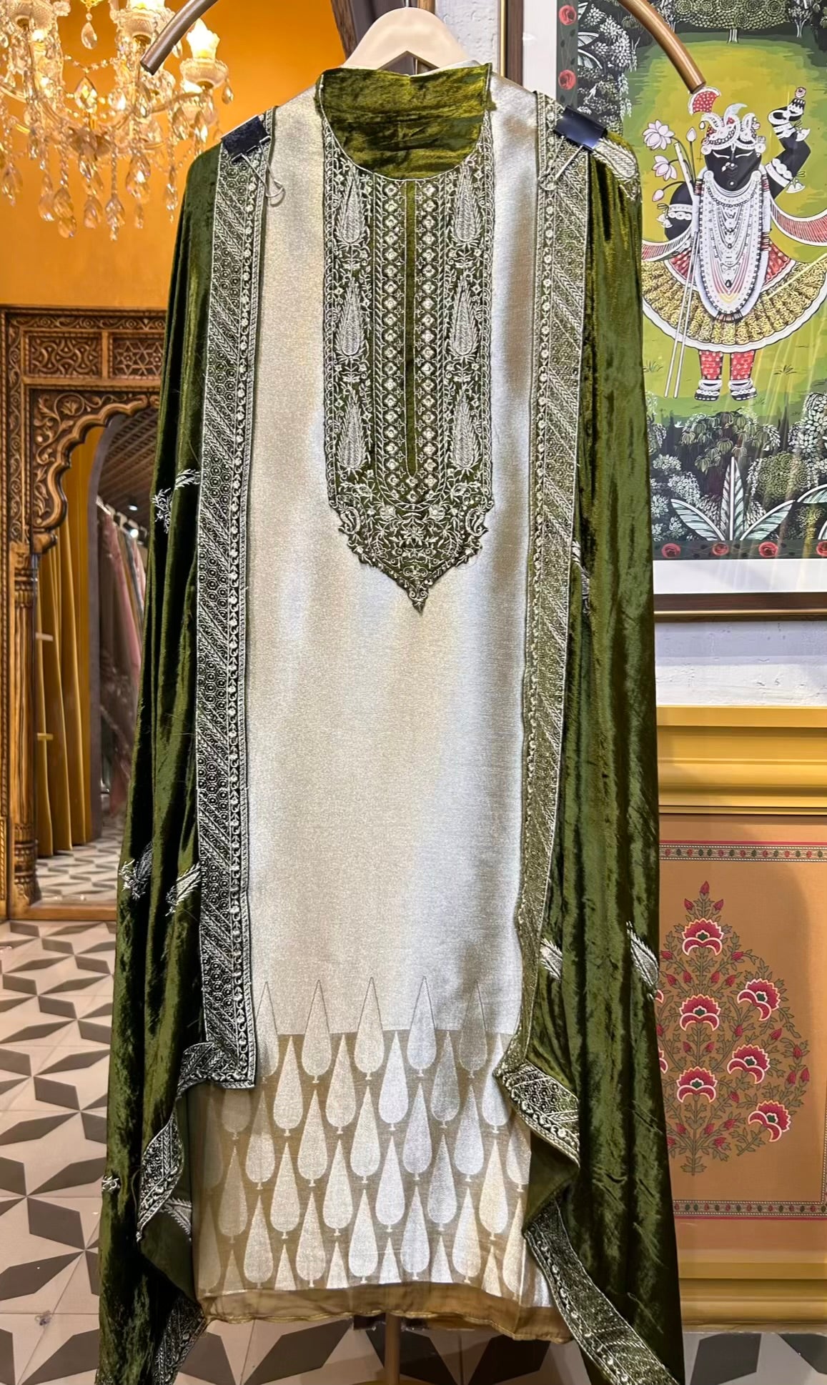 Paired with a plush velvet dupatta that drapes with luxurious weight and a pashmina bottom for cozy sophistication, this ensemble is a perfect harmony of warmth, opulence, and tradition — ideal for elegant winter festivities.